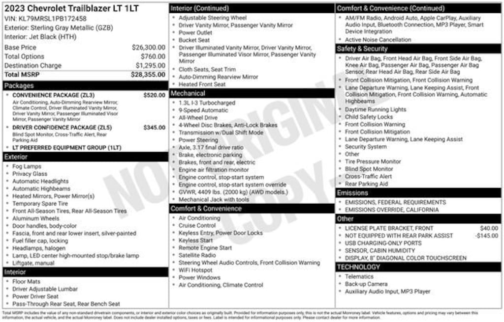 Recent Arrival! CARFAX One-Owner. Clean CARFAX. Odometer is 17159 miles below market average! Priced below KBB Fair Purchase Price!*** WE DELIVER ***Sterling Gray Metallic 2023 Chevrolet TrailBlazer LT 4D Sport Utility 1.3L Ecotec Turbo DOHC SIDI w/VVT 9-Speed Automatic AWDCertified. Chevrolet Certified Pre-Owned Details:* Limited Warranty: 12 Month/12,000 Mile (whichever comes first) from certified purchase date* Warranty Deductible: $0* Vehicle History* 172 Point Inspection* 24 months/24,000 miles (whichever comes first) Certified Pre-Owned Scheduled Maintenance Plan and 3 days/150 miles (whichever comes first) Vehicle Exchange Program. SiriusXM 3-month trial subscription.* Powertrain Limited Warranty: 72 Month/100,000 Mile (whichever comes first) from original in-service date* Transferable Warranty* Roadside Assistance1 Type-A & 1 Type-C USB Charging-Only Ports, 120-Volt Power Outlet, 2-Way Adjustable Front Head Restraints, 2-Way Power Driver Lumbar Seat Adjuster, 3.17 Axle Ratio, 4-Way Manual Front Passenger Seat Adjuster, 4-Wheel Disc Brakes, 6 Speakers, 6-Speaker Audio System Feature w/Amplifier, 7 Diagonal Color Touchscreen, 8-Way Power Driver Seat Adjuster, 8 Diagonal Color Touchscreen Display, ABS brakes, Air Conditioning, Alloy wheels, AM/FM radio: SiriusXM, Auto High-beam Headlights, Brake assist, Bumpers: body-color, Cabin Humidity Sensor, Cloth Seat Trim, Compass, Convenience Package, Delay-off headlights, Driver & Front Passenger Illuminated Vanity Mirrors, Driver Confidence Package, Driver door bin, Driver vanity mirror, Dual front impact airbags, Dual front side impact airbags, Electronic Stability Control, Emergency communication system: OnStar and Chevrolet connected services capable, Exterior Parking Camera Rear, Flat-Folding Front Passenger Seatback, Front anti-roll bar, Front Bucket Seats, Front Center Armrest, Front fog lights, Front License Plate Bracket, Front reading lights, Front wheel independent suspension, Fully automatic headlights, Heated door mirrors, Heated Driver & Front Passenger Seats, Heated front seats, Illuminated entry, Inside Rear-View Auto-Dimming Mirror, Knee airbag, Lane Change Alert w/Side Blind Zone Alert, Low tire pressure warning, Not Equipped w/Rear Park Assist (060), Occupant sensing airbag, Overhead airbag, Overhead console, Panic alarm, Passenger door bin, Passenger vanity mirror, Power door mirrors, Power driver seat, Power steering, Power windows, Preferred Equipment Group 1LT, Radio data system, Radio: Chevrolet Infotainment 3 System, Rear Cross Traffic Alert, Rear Park Assist, Rear side impact airbag, Rear window defroster, Rear window wiper, Remote keyless entry, Ride & Handling Suspension, Security system, Single-Zone Auto Climate Control Air Conditioning, SiriusXM Radio, Speed control, Split folding rear seat, Spoiler, Steering wheel mounted audio controls, Tachometer, Telescoping steering wheel, Tilt steering wheel, Traction control, Trip computer, Variably intermittent wipers, Wheels: 17 High Gloss Black Machined Aluminum, Wireless Apple CarPlay/Android Auto.