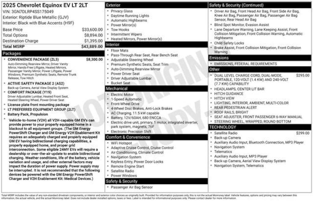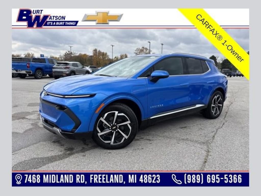 Recent Arrival! CARFAX One-Owner. Clean CARFAX. Odometer is 7203 miles below market average!*** WE DELIVER ***Riptide Blue Metallic 2025 Chevrolet Equinox EV LT 4D Sport Utility Electric Drive Unit 1-Speed Automatic FWDCertified. Chevrolet Certified Pre-Owned Details:* Roadside Assistance* 24 months/24,000 miles (whichever comes first) Certified Pre-Owned Scheduled Maintenance Plan and 3 days/150 miles (whichever comes first) Vehicle Exchange Program. SiriusXM 3-month trial subscription.* Warranty Deductible: $0* Limited Warranty: 12 Month/12,000 Mile (whichever comes first) from certified purchase date* Transferable Warranty* Powertrain Limited Warranty: 72 Month/100,000 Mile (whichever comes first) from original in-service date* 172 Point Inspection* Vehicle History19 Wheels, 3 Years SiriusXM, 4-Wheel Disc Brakes, 6 Speakers, 6-Speaker Audio System Feature, 6-Way Manual Front Passenger Seat Adjuster, 8-Way Power Driver Seat Adjuster, ABS brakes, Active Safety Package 2, Air Conditioning, Alloy wheels, AM/FM radio: SiriusXM with 360L, Ambient Multi-Color Interior Lighting, Auto High-beam Headlights, Automatic temperature control, AutoSense Hands-Free Power Programmable Liftgate, Brake assist, Bright Roof Rails, Bumpers: body-color, Center Lit Bar Headlamps, Cloth Seat Trim, Comfort Package, Compass, Convenience Package, Delay-off headlights, Driver & Front Passenger Visors, Driver 6-Way Manual Seat Adjuster, Driver door bin, Dual front impact airbags, Dual front side impact airbags, Dual Level Charge Cord, Electronic Stability Control, Emergency communication system: OnStar and Chevrolet connected services capable, Enhanced Traffic Sign Recognition, Evotex Seat Trim, Four wheel independent suspension, Front anti-roll bar, Front Bucket Seats, Front Center Armrest, Front Passenger 4-Way Manual Seat Adjuster, Front reading lights, Fully automatic headlights, HD Surround Vision, Heated Automatic Steering Wheel, Heated Driver & Fr Passenger Seats Cushion & Seatback, Heated Power-Adjustable Outside Mirrors, Hitch Guidance, Hitch View, Illuminated entry, Inside Rear-View Auto-Dimming Mirror, Knee airbag, Low tire pressure warning, Navigation system: Google built-in compatibility (select service plan required, terms and limitations apply), Occupant sensing airbag, Outside temperature display, Overhead airbag, Overhead console, Panic alarm, Passenger door bin, Power door mirrors, Power Driver Lumbar Control, Power steering, Power Windows, Power windows, Preferred Equipment Group 2LT, Radio: 17.7 Diagonal Advanced Color LCD Display, Rear anti-roll bar, Rear Pedestrian Alert, Rear reading lights, Rear seat center armrest, Rear window defroster, Rear window wiper, Remote keyless entry, Round Bottom Wrapped Steering Wheel, Security system, SiriusXM w/360L Trial Subscription, Speed control, Split folding rear seat, Spoiler, Steering wheel mounted audio controls, Telescoping steering wheel, Tilt steering wheel, Traction control, Trip computer, Turn signal indicator mirrors, Variably intermittent wipers, Wireless Phone Charging.