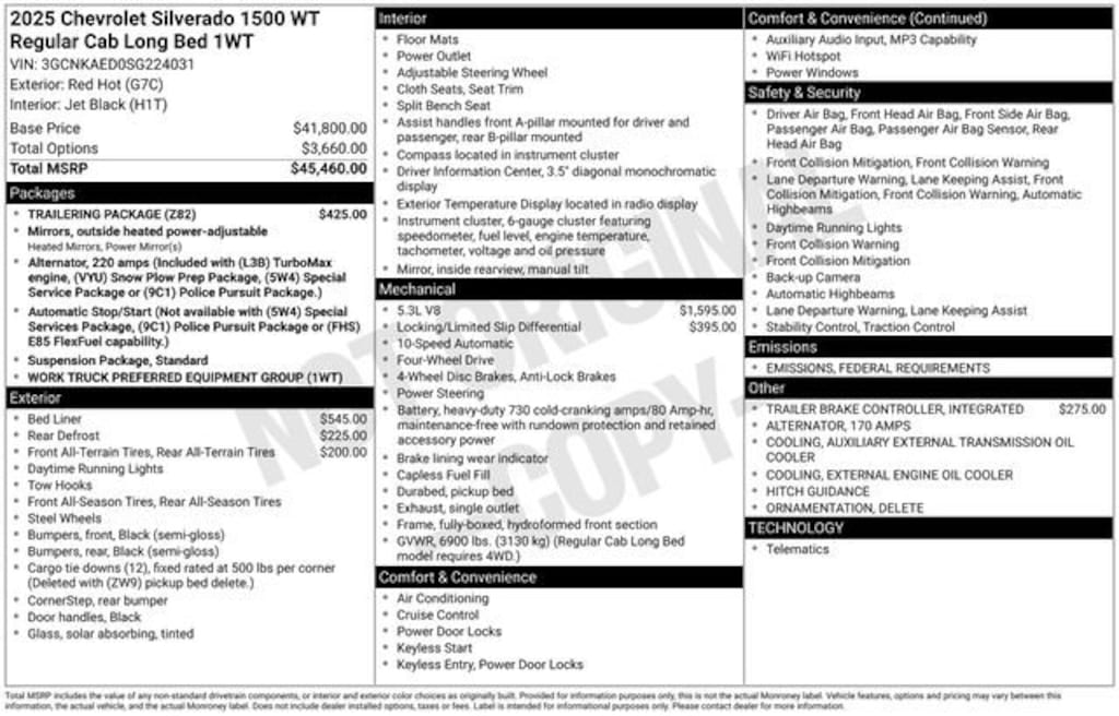 2-Speaker Audio System, 3.23 Rear Axle Ratio, 3.5 Monochromatic Display Driver Info Center, 4-Way Manual Driver Seat Adjuster, 4-Wheel Disc Brakes, ABS brakes, Air Conditioning, Apple CarPlay/Android Auto, Auto High-beam Headlights, Automatic Emergency Braking, Black (Semi-Gloss) Front Bumper, Black (Semi-Gloss) Rear Bumper, Bluetooth® For Phone, Brake assist, Compass, Dual front impact airbags, Dual front side impact airbags, Electronic Cruise Control, Electronic Stability Control, Emergency communication system: OnStar, Following Distance Indicator, Forward Collision Alert, Front Frame-Mounted Black Recovery Hooks, Front Pedestrian Braking, Fully automatic headlights, HD Rear Vision Camera, Heated Power-Adjustable Outside Mirrors, Illuminated entry, Inside Rear-View Mirror w/Tilt, IntelliBeam Automatic High Beam On/Off, Lane Keep Assist w/Lane Departure Warning, Locking Tailgate, Low tire pressure warning, Manual Tilt Wheel Steering Column, Occupant sensing airbag, OnStar Services Capable, Outside temperature display, Overhead airbag, Power door mirrors, Power Front Windows w/Driver Express Up/Down, Power Front Windows w/Passenger Express Down, Preferred Equipment Group 1WT, Radio data system, Remote Keyless Entry, Rubberized-Vinyl Floor Covering, SiriusXM Delete, Solar Absorbing Tinted Glass, Standard Tailgate, Teen Driver, Tilt steering wheel, Tire Pressure Monitoring System, Traction control, Variably intermittent wipers, Wi-Fi Hot Spot Capable, 2 Speakers, 220 Amp Alternator, 40/20/40 Front Split Bench Seat, Delay-off headlights, Driver door bin, Front anti-roll bar, Front Center Armrest w/Storage, Front reading lights, Front wheel independent suspension, Heated door mirrors, Overhead console, Panic alarm, Passenger door bin, Passenger vanity mirror, Power steering, Power windows, Premium audio system: Chevrolet Infotainment 3, Radio: Chevrolet Infotainment 3 System, Rear reading lights, Rear step bumper, Remote keyless entry, Speed control, Speed-sensing steering, Standard Suspension Package, Tachometer, Trip computer, Vinyl Seat Trim, Voltmeter, Wheels: 17 x 8 Ultra Silver Painted Steel, 2-Speaker Audio System, 3.23 Rear Axle Ratio, 3.5 Monochromatic Display Driver Info Center, 4-Way Manual Driver Seat Adjuster, 4-Wheel Disc Brakes, ABS brakes, Air Conditioning, Apple CarPlay/Android Auto, Auto High-beam Headlights, Automatic Emergency Braking, Black (Semi-Gloss) Front Bumper, Black (Semi-Gloss) Rear Bumper, Bluetooth® For Phone, Brake assist, Compass, Dual front impact airbags, Dual front side impact airbags, Electronic Cruise Control, Electronic Stability Control, Emergency communication system: OnStar, Following Distance Indicator, Forward Collision Alert, Front Frame-Mounted Black Recovery Hooks, Front Pedestrian Braking, Fully automatic headlights, HD Rear Vision Camera, Heated Power-Adjustable Outside Mirrors, Illuminated entry, Inside Rear-View Mirror w/Tilt, IntelliBeam Automatic High Beam On/Off, Lane Keep Assist w/Lane Departure Warning, Locking Tailgate, Low tire pressure warning, Manual Tilt Wheel Steering Column, Occupant sensing airbag, OnStar Services Capable, Outside temperature display, Overhead airbag, Power door mirrors, Power Front Windows w/Driver Express Up/Down, Power Front Windows w/Passenger Express Down, Preferred Equipment Group 1WT, Radio data system, Remote Keyless Entry, Rubberized-Vinyl Floor Covering, SiriusXM Delete, Solar Absorbing Tinted Glass, Standard Tailgate, Teen Driver, Tilt steering wheel, Tire Pressure Monitoring System, Traction control, Variably intermittent wipers, Wi-Fi Hot Spot Capable. Rebates listed are for zip code 48623. Must qualify for GMS Employee purchase plan$1000 - Bonus Cash. Exp. 09/30/2025 $2250 - Customer Cash. Exp. 09/30/2025