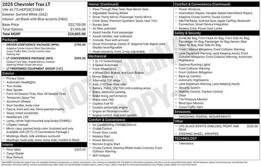 6-Speaker Audio System Feature, ABS brakes, Adaptive Cruise Control, Air Conditioning, AM/FM radio: SiriusXM, Auto High-beam Headlights, Automatic temperature control, Brake assist, Compass, Driver Confidence Package, Dual front impact airbags, Dual front side impact airbags, Electronic Stability Control, Emergency communication system: OnStar One Essentials, Exterior Parking Camera Rear, Front & Rear All-Weather Floor Liners (LPO), Front & Rear Black Bowtie Emblems (LPO), Front Doors Keyless Open, Fully automatic headlights, Heated Driver & Front Passenger Seats, Heated Power-Adjustable Outside Mirrors, Heated Steering Wheel, Illuminated entry, Lane Change Alert w/Side Blind Zone Alert, Low tire pressure warning, LT Convenience Package, Occupant sensing airbag, Outside temperature display, Overhead airbag, Power door mirrors, Preferred Equipment Group 1LT, Premium audio system: Chevrolet Infotainment 3, Radio data system, Radio: AM/FM Stereo Audio System, Rear Cross-Traffic Alert, Rear Park Assist, Rear window defroster, Rear window wiper, Remote keyless entry, Security system, SiriusXM Trial Subscription, Split folding rear seat, Steering wheel mounted audio controls, Telescoping steering wheel, Tilt steering wheel, Traction control, Variably intermittent wipers, Wheels: 17 Gray-Painted Machined Aluminum, Wrapped Steering Wheel, 2-Way Adjustable Front Head Restraints, 3.50 Final Drive Axle Ratio, 4-Way Manual Front Passenger Seat Adjuster, 4-Wheel Disc Brakes, 6 Speakers, 6-Way Manual Driver Seat Adjuster, Alloy wheels, Bumpers: body-color, Cloth/Evotex Seat Trim, Delay-off headlights, Driver door bin, Driver vanity mirror, Front anti-roll bar, Front Bucket Seats, Front Center Armrest, Front reading lights, Front wheel independent suspension, Overhead console, Panic alarm, Passenger door bin, Passenger vanity mirror, Power steering, Power windows, Speed control, Spoiler, Tachometer, Trip computer, 6-Speaker Audio System Feature, ABS brakes, Adaptive Cruise Control, Air Conditioning, AM/FM radio: SiriusXM, Auto High-beam Headlights, Automatic temperature control, Brake assist, Compass, Driver Confidence Package, Dual front impact airbags, Dual front side impact airbags, Electronic Stability Control, Emergency communication system: OnStar One Essentials, Exterior Parking Camera Rear, Front & Rear All-Weather Floor Liners (LPO), Front & Rear Black Bowtie Emblems (LPO), Front Doors Keyless Open, Fully automatic headlights, Heated Driver & Front Passenger Seats, Heated Power-Adjustable Outside Mirrors, Heated Steering Wheel, Illuminated entry, Lane Change Alert w/Side Blind Zone Alert, Low tire pressure warning, LT Convenience Package, Occupant sensing airbag, Outside temperature display, Overhead airbag, Power door mirrors, Preferred Equipment Group 1LT, Premium audio system: Chevrolet Infotainment 3, Radio data system, Radio: AM/FM Stereo Audio System, Rear Cross-Traffic Alert, Rear Park Assist, Rear window defroster, Rear window wiper, Remote keyless entry, Security system, SiriusXM Trial Subscription, Split folding rear seat, Steering wheel mounted audio controls, Telescoping steering wheel, Tilt steering wheel, Traction control, Variably intermittent wipers, Wheels: 17 Gray-Painted Machined Aluminum, Wrapped Steering Wheel.