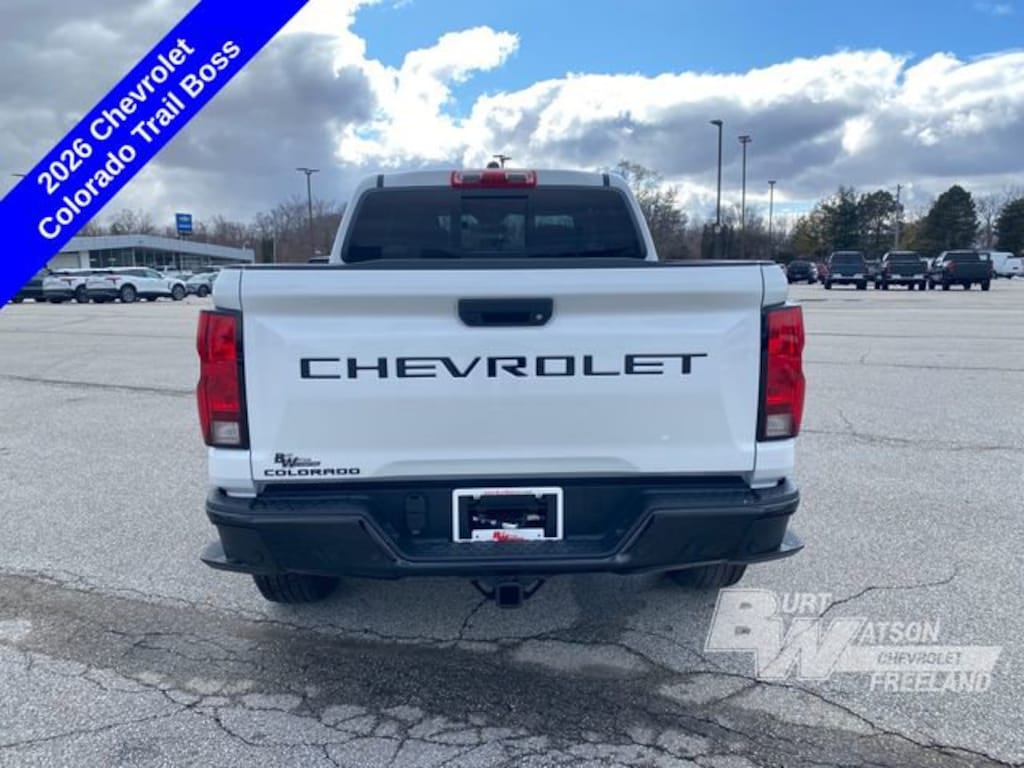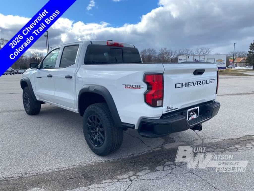 Recent Arrival! Factory MSRP: $46,635 $4,119 off MSRP!*** WE DELIVER ***Summit White 2026 Chevrolet Colorado Trail Boss 4D Crew Cab 4WD 2.7L I4 Turbocharged DOHC 16V LEV3-ULEV50 310hp 8-Speed Automatic1st and 2nd Row All-Weather Floor Liner, 3.42 Rear Axle Ratio, 4-Spoke Wrapped Steering Wheel, 4-Wheel Disc Brakes, 6-Speaker Audio System Feature, 8-Way Power Driver Seat Adjuster, ABS brakes, Air Conditioning, AM/FM radio: SiriusXM with 360L, Apple CarPlay/Android Auto, Auto High-beam Headlights, Automatic Emergency Braking, Automatic temperature control, Black Lug Nut & Wheel Lock Kit, Black Nameplates, Black Spray-on Bedliner with Chevrolet Logo, Brake assist, Chevy Safety Assist, Compass, Driver and Front Passenger Heated Seats, Dual front impact airbags, Dual front side impact airbags, Electronic Stability Control, Emergency communication system: OnStar, Evotex Seat Trim, Following Distance Indicator, Forward Collision Alert, Front dual zone A/C, Front Pedestrian and Bicyclist Braking, Gloss Black Tailgate Lettering, Heated door mirrors, Heated Steering Wheel, Illuminated entry, IntelliBeam Automatic High Beam on/Off, Lane Keep Assist with Lane Departure Warning, Low tire pressure warning, Occupant sensing airbag, Outside temperature display, Overhead airbag, Power door mirrors, Power Driver Lumbar Control Seat Adjuster, Preferred Equipment Group 0TR, Radio data system, Radio: 11.3 Diagonal Advanced Color LCD Display, Rear window defroster, Remote keyless entry, Remote Vehicle Starter System, Security system, SiriusXM with 360L Trial Subscription, Speed control, Steering Wheel Mounted Audio Controls, Steering wheel mounted audio controls, Tilt steering wheel, Traction control, Trail Boss Convenience Package II, Variably intermittent wipers, Wheels: 18 x 8.5 Black High Gloss Aluminum, Wireless Phone Charging, Wireless Phone Projection, 4-Way Manual Passenger Seat Adjuster, 6 Speakers, 6-Way Manual Driver Seat Adjuster, Alloy wheels, Cloth Seat Trim, Delay-off headlights, Driver door bin, Driver vanity mirror, Front anti-roll bar, Front Bucket Seats, Front Center Armrest, Front wheel independent suspension, Navigation System, Overhead console, Panic alarm, Passenger door bin, Passenger vanity mirror, Power steering, Power windows, Rear reading lights, Rear step bumper, Speed-sensing steering, Split folding rear seat, Tachometer, Trip computer, 1st and 2nd Row All-Weather Floor Liner, 3.42 Rear Axle Ratio, 4-Spoke Wrapped Steering Wheel, 4-Wheel Disc Brakes, 6-Speaker Audio System Feature, 8-Way Power Driver Seat Adjuster, ABS brakes, Air Conditioning, AM/FM radio: SiriusXM with 360L, Apple CarPlay/Android Auto, Auto High-beam Headlights, Automatic Emergency Braking, Automatic temperature control, Black Lug Nut & Wheel Lock Kit, Black Nameplates, Black Spray-on Bedliner with Chevrolet Logo, Brake assist, Chevy Safety Assist, Compass, Driver and Front Passenger Heated Seats, Dual front impact airbags, Dual front side impact airbags, Electronic Stability Control, Emergency communication system: OnStar, Evotex Seat Trim, Following Distance Indicator, Forward Collision Alert, Front dual zone A/C, Front Pedestrian and Bicyclist Braking, Gloss Black Tailgate Lettering, Heated door mirrors, Heated Steering Wheel, Illuminated entry, IntelliBeam Automatic High Beam on/Off, Lane Keep Assist with Lane Departure Warning, Low tire pressure warning, Occupant sensing airbag, Outside temperature display, Overhead airbag, Power door mirrors, Power Driver Lumbar Control Seat Adjuster, Preferred Equipment Group 0TR, Radio data system, Radio: 11.3 Diagonal Advanced Color LCD Display, Rear window defroster, Remote keyless entry, Remote Vehicle Starter System, Security system, SiriusXM with 360L Trial Subscription, Speed control, Steering Wheel Mounted Audio Controls, Steering wheel mounted audio controls, Tilt steeri Rebates listed are for zip code 48623. Must qualify for GMS Employee purchase plan$500 - Customer Cash.