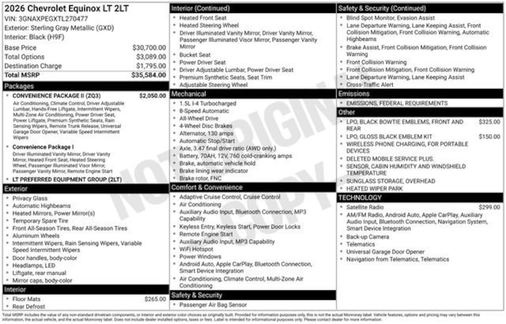 Recent Arrival! Factory MSRP: $35,584 $2,674 off MSRP!*** WE DELIVER ***Sterling Gray Metallic 2026 Chevrolet Equinox LT 4D Sport Utility AWD 1.5L DOHC 8-Speed Automatic2-Way Power Driver Lumbar Control Seat Adjuster, 3 Years SiriusXM, 4-Wheel Disc Brakes, 6 Speakers, ABS brakes, Air Conditioning, All-Weather Floor Liners (LPO), AM/FM radio: SiriusXM, Auto High-beam Headlights, AutoSense Hands-Free Power Programmable Liftgate, Brake assist, Cabin Humidity & Windshield Sensor, Compass, Convenience Package II, Driver 8-Way Power Seat Adjuster, Dual front impact airbags, Dual front side impact airbags, Dual-Zone Automatic Climate Control, Electronic Stability Control, Emergency communication system: OnStar and Chevrolet connected services capable, Evotex Seat Trim, Front & Rear Black Bowtie Emblems (LPO), Fully automatic headlights, Gloss Black Emblem Kit (LPO), Heated door mirrors, Heated Driver & Front Passenger Seats, Heated steering wheel, Heated Wiper Park, Illuminated entry, Intermittent Front Rain-Sensing Wipers, Low tire pressure warning, Occupant sensing airbag, Outside temperature display, Overhead airbag, Overhead Sunglass Storage, Power door mirrors, Preferred Equipment Group 2LT, Premium audio system: Chevrolet Infotainment 3, Programmable Universal Home Remote, Radio data system, Radio: 11.3 Diagonal Advanced Color LCD Display, Rear window defroster, Rear window wiper, Remote keyless entry, Second Row All-Weather Mat (LPO), Security system, SiriusXM w/360L Trial Subscription, Speed control, Split folding rear seat, Steering wheel mounted audio controls, Telescoping steering wheel, Tilt steering wheel, Traction control, Variably intermittent wipers, Wheels: 17 Grazen Metallic Machined-Face Aluminum, Wireless Phone Charging for Portable Devices, 3.47 Final Drive Axle Ratio, Alloy wheels, Bumpers: body-color, Cloth Seat Trim, Delay-off headlights, Deleted Mobile Service Plus, Driver 6-Way Manual Seat Adjuster, Driver door bin, Driver vanity mirror, Four wheel independent suspension, Front anti-roll bar, Front Bucket Seats, Front Center Armrest, Front Passenger 4-Way Manual Seat Adjuster, Front reading lights, Heated front seats, Navigation System, Overhead console, Panic alarm, Passenger door bin, Passenger vanity mirror, Power steering, Power windows, Rear anti-roll bar, Rear reading lights, Rear seat center armrest, Speed-sensing steering, Spoiler, Tachometer, Trip computer, 2-Way Power Driver Lumbar Control Seat Adjuster, 3 Years SiriusXM, 4-Wheel Disc Brakes, 6 Speakers, ABS brakes, Air Conditioning, All-Weather Floor Liners (LPO), AM/FM radio: SiriusXM, Auto High-beam Headlights, AutoSense Hands-Free Power Programmable Liftgate, Brake assist, Cabin Humidity & Windshield Sensor, Compass, Convenience Package II, Driver 8-Way Power Seat Adjuster, Dual front impact airbags, Dual front side impact airbags, Dual-Zone Automatic Climate Control, Electronic Stability Control, Emergency communication system: OnStar and Chevrolet connected services capable, Evotex Seat Trim, Front & Rear Black Bowtie Emblems (LPO), Fully automatic headlights, Gloss Black Emblem Kit (LPO), Heated door mirrors, Heated Driver & Front Passenger Seats, Heated steering wheel, Heated Wiper Park, Illuminated entry, Intermittent Front Rain-Sensing Wipers, Low tire pressure warning, Occupant sensing airbag, Outside temperature display, Overhead airbag, Overhead Sunglass Storage, Power door mirrors, Preferred Equipment Group 2LT, Premium audio system: Chevrolet Infotainment 3, Programmable Universal Home Remote, Radio data system, Radio: 11.3 Diagonal Advanced Color LCD Display, Rear window defroster, Rear window wiper, Remote keyless entry, Second Row All-Weather Mat (LPO), Security system, SiriusXM w/360L Trial Subscription, Speed control, Split folding rear seat, Steering wheel mounted audio controls, Telescoping steering wheel, Tilt steering wheel, Traction control, Variably intermittent wipers, Wheels: 17 Grazen Metalli