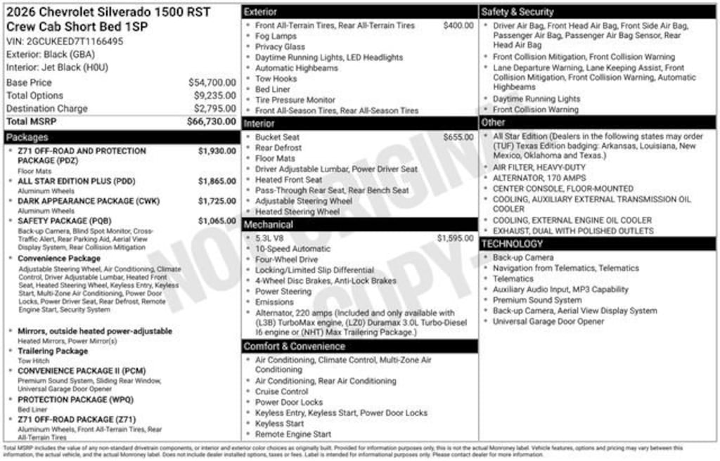 10-Way Power Driver Seat with Lumbar, 12.3 Multicolor Reconfigurable Digital Display, 120-Volt Bed Mounted Power Outlet, 120-Volt Interior Power Outlet, 2 USB Data Ports, 3.23 Rear Axle Ratio, 4-Wheel Disc Brakes, 6-Speaker Audio System, ABS brakes, Air Conditioning, All-Star Edition, All-Weather Floor Liner, AM/FM radio: SiriusXM with 360L, Apple CarPlay/Android Auto, Auto High-beam Headlights, Auto-Locking Rear Differential, Automatic Emergency Braking, Automatic temperature control, Bluetooth® For Phone, Brake assist, Chevytec Spray-on Black Bedliner, Cloth Seat Trim, Color-Keyed Carpeting Floor Covering, Compass, Convenience Package, Convenience Package II, Dark Appearance Package, Deep-Tinted Glass, Dual Exhaust with Polished Outlets, Dual front impact airbags, Dual front side impact airbags, Dual Rear USB Ports (charge Only), Dual-Zone Automatic Climate Control, Electric Rear-Window Defogger, Electronic Cruise Control, Electronic Stability Control, Electronic Transmission Range Selector Shifter, Emergency communication system: OnStar, EZ Lift Power Lock and Release Tailgate, Floor Mounted Center Console, Following Distance Indicator, Forward Collision Alert, Front Bucket Seats, Front dual zone A/C, Front fog lights, Front Frame-Mounted Black Recovery Hooks, Front LED Fog Lamps, Front Pedestrian Braking, Front Rubberized Vinyl Floor Mats, Fully automatic headlights, HD Rear Vision Camera, HD Surround Vision, Heated Driver and Front Outboard Passenger Seats, Heated Power-Adjustable Outside Mirrors, Heated Steering Wheel, Heavy-Duty Air Filter, High Capacity Suspension Package, High Gloss Black Mirror Caps, Hill Descent Control, Hitch Guidance, Hitch Guidance with Hitch View, Illuminated entry, in-Vehicle Trailering System App, Inside Rearview Mirror with Tilt, Integrated Trailer Brake Controller, IntelliBeam Automatic High Beam on/Off, Keyless Open and Start, Lane Keep Assist with Lane Departure Warning, LED Cargo Area Lighting, Low tire pressure warning, Manual Tilt/Telescoping Steering Column, Occupant sensing airbag, Off-Road Suspension, OnStar Services Capable, Outside temperature display, Overhead airbag, Perimeter Lighting, Power door mirrors, Power driver seat, Power Front Windows with Driver Express Up/Down, Power Front Windows with Passenger Express Down, Power Rear Windows with Express Down, Power Sliding Rear Window with Rear Defogger, Preferred Equipment Group 1SP, Premium audio system: Chevrolet Infotainment 3 Premium, Premium Bose 7-Speaker Sound System, Protection Package, Radio data system, Radio: Chevrolet Infotainment 3 Premium System, Rear 60/40 Folding Bench Seat (folds Up), Rear Cross Traffic Braking, Rear Pedestrian Alert, Rear Rubberized-Vinyl Floor Mats, Rear Wheelhouse Liners, Remote keyless entry, Remote Vehicle Starter System, Safety Package, SiriusXM with 360L Trial Subscription, Standard Tailgate, Steering Wheel Audio Controls, Teen Driver, Telescoping steering wheel, Theft Deterrent System (unauthorized Entry), Tilt steering wheel, Tire Pressure Monitoring System, Traction control, Trailer Camera Provisions, Trailer Side Blind Zone Alert, Trailering Package, Ultrasonic Front and Rear Park Assist, Universal Home Remote, Wheels: 20 x 9 High Gloss Black Painted Aluminum, Wi-Fi Hot Spot Capable, Wireless Charging, Wrapped Steering Wheel, Z71 Off-Road and Protection Package, Z71 Off-Road Package, 170 Amp Alternator, 220 Amp Alternator, 6 Speakers, All Star Edition Plus, Alloy wheels, Auxiliary External Transmission Oil Cooler, Bumpers: body-color, Delay-off headlights, Driver door bin, Driver vanity mirror, External Rebates listed are for zip code 48623. Must qualify for GMS Employee purchase plan$1500 - Bonus Cash. Exp. 04/30/2026 $3580 - Supplier Discount for Eve