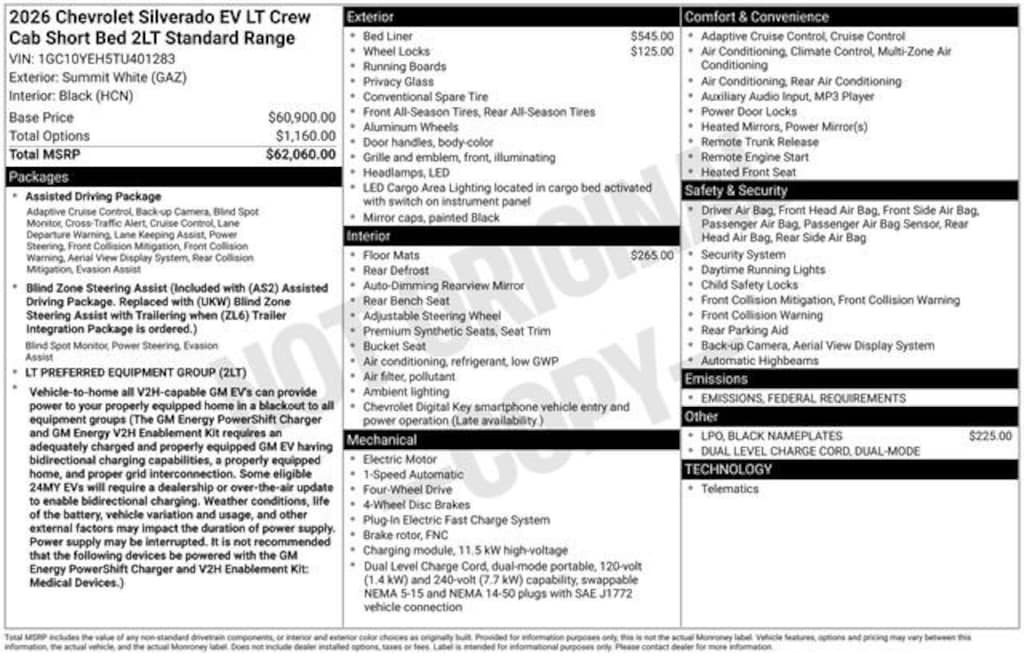 1st & 2nd Row All-Weather Floor Liners (LPO), 4-Wheel Disc Brakes, 6-Speaker Audio System Feature, 8-Way Power Driver Seat Adjuster, ABS brakes, Air Conditioning, AM/FM radio: SiriusXM with 360L, Auto High-beam Headlights, Automatic temperature control, Black Chevytec Spray-On Bedliner, Black Name Plates (LPO), Brake assist, Dual front impact airbags, Dual front side impact airbags, Electronic Stability Control, Emergency communication system: OnStar, Front Bucket Seats, Front dual zone A/C, Fully automatic headlights, Garage door transmitter, Heated door mirrors, Heated steering wheel, Low tire pressure warning, Occupant sensing airbag, Outside temperature display, Overhead airbag, Preferred Equipment Group 2LT, Radio data system, Radio: 17.7 Diagonal Advanced Color LCD Display, Rain sensing wipers, Rear window defroster, Remote keyless entry, Security system, Set of 4 Wheel Locks (LPO), SiriusXM w/360L Trial Subscription, Speed control, Split folding rear seat, Standard Range Battery Pack, Steering wheel mounted audio controls, Telescoping steering wheel, Tilt steering wheel, Traction control, Variably intermittent wipers, Wheels: 18 x 8.5 High Gloss Black Painted Alum, 4-Wheel Independent Suspension, 6 Speakers, Alloy wheels, Auto-dimming Rear-View mirror, Axle Ratio: TBD, Delay-off headlights, Driver 2-Way Power Lumbar Seat Adjuster, Driver door bin, Driver vanity mirror, Evotex Seat Trim, Four wheel independent suspension, Front anti-roll bar, Front Center Armrest w/Storage, Front Passenger 4-Way Manual Seat Adjuster, Front reading lights, Heated Front Driver & Passenger Seats, Heated front seats, Navigation System, Overhead console, Panic alarm, Passenger door bin, Passenger vanity mirror, Power door mirrors, Power driver seat, Power steering, Power windows, Rear reading lights, Rear step bumper, Speed-sensing steering, Sport steering wheel, Trip computer, 1st & 2nd Row All-Weather Floor Liners (LPO), 4-Wheel Disc Brakes, 6-Speaker Audio System Feature, 8-Way Power Driver Seat Adjuster, ABS brakes, Air Conditioning, AM/FM radio: SiriusXM with 360L, Auto High-beam Headlights, Automatic temperature control, Black Chevytec Spray-On Bedliner, Black Name Plates (LPO), Brake assist, Dual front impact airbags, Dual front side impact airbags, Electronic Stability Control, Emergency communication system: OnStar, Front Bucket Seats, Front dual zone A/C, Fully automatic headlights, Garage door transmitter, Heated door mirrors, Heated steering wheel, Low tire pressure warning, Occupant sensing airbag, Outside temperature display, Overhead airbag, Preferred Equipment Group 2LT, Radio data system, Radio: 17.7 Diagonal Advanced Color LCD Display, Rain sensing wipers, Rear window defroster, Remote keyless entry, Security system, Set of 4 Wheel Locks (LPO), SiriusXM w/360L Trial Subscription, Speed control, Split folding rear seat, Standard Range Battery Pack, Steering wheel mounted audio controls, Telescoping steering wheel, Tilt steering wheel, Traction control, Variably intermittent wipers, Wheels: 18 x 8.5 High Gloss Black Painted Alum.