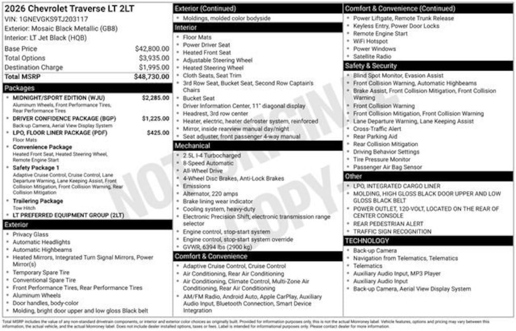 Mosaic Black Metallic 2026 Chevrolet Traverse LT 2LT 4D Sport Utility AWD 2.5L DOHC 8-Speed Automatic
