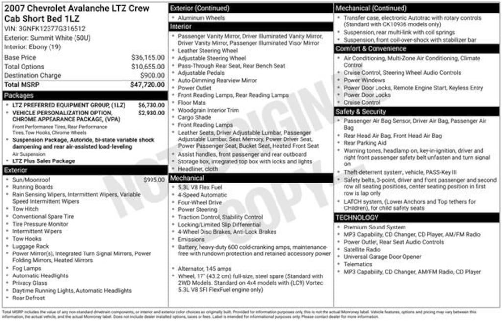 Summit White 2007 Chevrolet Avalanche 1500 LTZ Vortec 5.3L V8 SFI Flex Fuel 4-Speed Automatic with Overdrive 4WD 4D Crew Cab