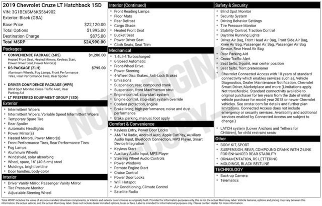 Black 2019 Chevrolet Cruze LT 1.4L 4-Cylinder Turbo DOHC CVVT 6-Speed Automatic FWD 4D Hatchback