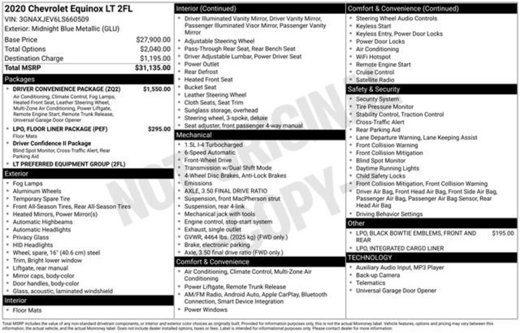 Recent Arrival! CARFAX One-Owner. Clean CARFAX. Priced below KBB Fair Purchase Price!*** WE DELIVER ***Midnight Blue Metallic 2020 Chevrolet Equinox LT 4D Sport Utility 1.5L DOHC 6-Speed Automatic Electronic with Overdrive FWD17 Aluminum Wheels, 2 Rear USB Charging-Only Ports, 2 USB Ports & Auxiliary Input Jack, 2-Way Power Driver Lumbar Control Seat Adjuster, 3-Spoke Leather-Wrapped Steering Wheel, 3.50 Final Drive Axle Ratio, 4-Wheel Disc Brakes, 6 Speaker Audio System Feature, 6 Speakers, 8-Way Power Driver Seat Adjuster, ABS brakes, Air Conditioning, All-Weather Floor Liners (LPO), Alloy wheels, AM/FM radio: SiriusXM, Apple CarPlay/Android Auto, Auto High-beam Headlights, Bluetooth® For Phone, Brake assist, Bumpers: body-color, Compass, Delay-off headlights, Driver Convenience Package, Driver door bin, Driver vanity mirror, Dual front impact airbags, Dual front side impact airbags, Dual Zone Automatic Climate Control, Electronic Stability Control, Emergency communication system: OnStar and Chevrolet connected services capable, Floor Liner Package (LPO), Four wheel independent suspension, Front & Rear Black Bowtie Emblems (LPO), Front anti-roll bar, Front Bucket Seats, Front Center Armrest, Front Fog Lamps, Front Passenger 4-Way Manual Seat Adjuster, Front reading lights, Fully automatic headlights, Heated door mirrors, Heated Driver & Front Passenger Seats, High-Intensity Discharge Headlights, Illuminated entry, Integrated Cargo Liner (LPO), Low tire pressure warning, Occupant sensing airbag, Outside temperature display, Overhead airbag, Overhead console, Panic alarm, Passenger door bin, Passenger vanity mirror, Power door mirrors, Power driver seat, Power steering, Power windows, Preferred Equipment Group 2FL, Premium audio system: Chevrolet Infotainment 3, Premium Cloth Seat Trim, Radio data system, Radio: Chevrolet Infotainment 3 System w/AM/FM, Rear anti-roll bar, Rear Power Liftgate, Rear reading lights, Rear seat center armrest, Rear window defroster, Rear window wiper, Remote keyless entry, Remote Start, Security system, SiriusXM Radio, Speed control, Speed-sensing steering, Split folding rear seat, Spoiler, Steering wheel mounted audio controls, Tachometer, Telescoping steering wheel, Tilt steering wheel, Traction control, Trip computer, Universal Home Remote, Variably intermittent wipers.