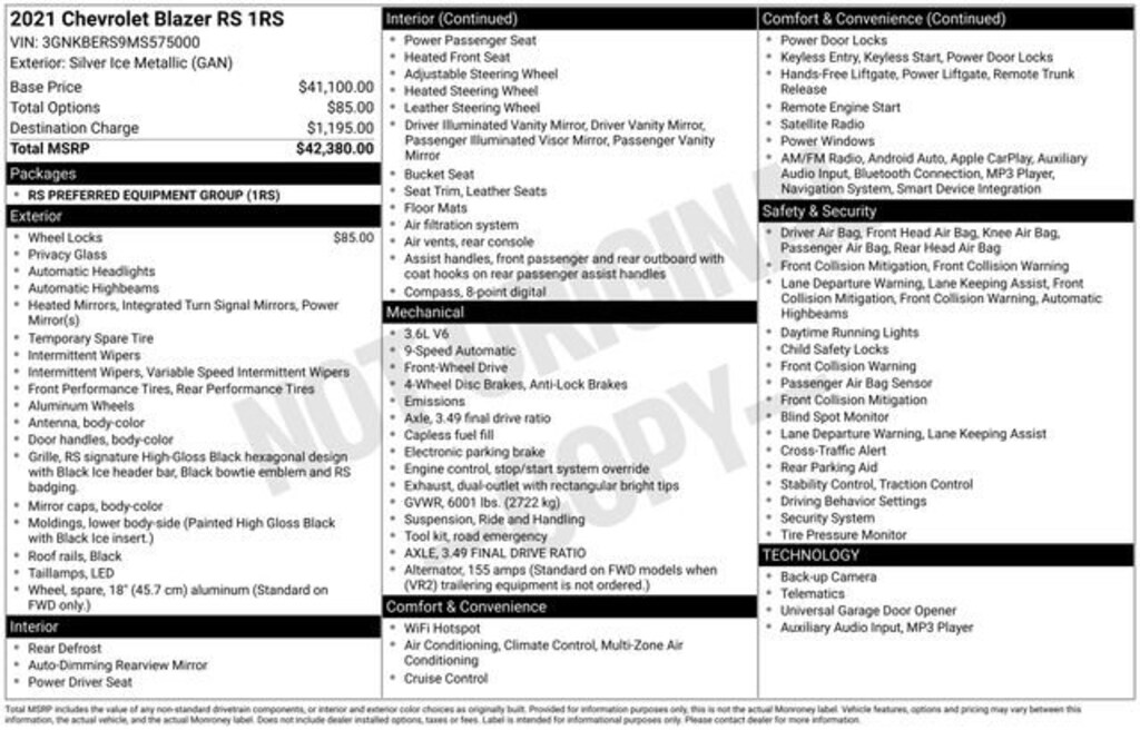 Recent Arrival! Clean CARFAX.*** WE DELIVER ***Silver Ice Metallic 2021 Chevrolet Blazer RS 3.6L V6 SIDI DOHC VVT 9-Speed Automatic FWD 4D Sport UtilityLocal Trade, Non Smoker, 172 point inspection certified, 1st oil change free with purchase, 2 Key Fobs, 3.49 Final Drive Axle Ratio, 4-Wheel Disc Brakes, 6 Speakers, 6-Speaker Audio System Feature, 6-Way Power Front Passenger Seat Adjuster, ABS brakes, Air Conditioning, Alloy wheels, AM/FM radio: SiriusXM, Apple CarPlay/Android Auto, Auto High-beam Headlights, Auto-dimming door mirrors, Auto-dimming Rear-View mirror, Automatic temperature control, Brake assist, Bright Wheel Locks (LPO), Bumpers: body-color, Child-Seat-Sensing Airbag, Compass, Delay-off headlights, Driver door bin, Driver vanity mirror, Dual front impact airbags, Dual front side impact airbags, Electronic Stability Control, Emergency communication system: OnStar and Chevrolet connected services capable, Exterior Parking Camera Rear, Four wheel independent suspension, Front anti-roll bar, Front Bucket Seats, Front Center Armrest, Front dual zone A/C, Front reading lights, Fully automatic headlights, Garage door transmitter, Heated door mirrors, Heated Driver & Front Passenger Seats, Heated front seats, Heated steering wheel, High-Intensity Discharge Headlights, Illuminated entry, Knee airbag, Low tire pressure warning, Occupant sensing airbag, Outside temperature display, Overhead airbag, Overhead console, Panic alarm, Passenger door bin, Passenger vanity mirror, Perforated Leather-Appointed Seat Trim, Power door mirrors, Power driver seat, Power Liftgate, Power passenger seat, Power steering, Power windows, Preferred Equipment Group 1RS, Radio data system, Radio: Chevrolet Infotainment 3 Plus System, Rear anti-roll bar, Rear reading lights, Rear seat center armrest, Rear window defroster, Rear window wiper, Remote keyless entry, Ride & Handling Suspension, Security system, SiriusXM w/360L, Speed control, Speed-sensing steering, Split folding rear seat, Spoiler, Steering wheel mounted audio controls, Tachometer, Telescoping steering wheel, Tilt steering wheel, Traction control, Trip computer, Turn signal indicator mirrors, Variably intermittent wipers, Voltmeter, Wheels: 20 Dark Android Machined-Face Aluminum, Leather Shift Knob, Navigation System, 3.49 Final Drive Axle Ratio, 4-Wheel Disc Brakes, 6 Speakers, 6-Speaker Audio System Feature, 6-Way Power Front Passenger Seat Adjuster, ABS brakes, Air Conditioning, Alloy wheels, AM/FM radio: SiriusXM, Apple CarPlay/Android Auto, Auto High-beam Headlights, Auto-dimming door mirrors, Auto-dimming Rear-View mirror, Automatic temperature control, Brake assist, Bright Wheel Locks (LPO), Bumpers: body-color, Child-Seat-Sensing Airbag, Compass, Delay-off headlights, Driver door bin, Driver vanity mirror, Dual front impact airbags, Dual front side impact airbags, Electronic Stability Control, Emergency communication system: OnStar and Chevrolet connected services capable, Exterior Parking Camera Rear, Four wheel independent suspension, Front anti-roll bar, Front Bucket Seats, Front Center Armrest, Front dual zone A/C, Front reading lights, Fully automatic headlights, Garage door transmitter, Heated door mirrors, Heated Driver & Front Passenger Seats, Heated front seats, Heated steering wheel, High-Intensity Discharge Headlights, Illuminated entry, Knee airbag, Low tire pressure warning, Occupant sensing airbag, Outside temperature display, Overhead airbag, Overhead console, Panic alarm, Passenger door bin, Passenger vanity mirror, Perforated Leather-Appointed Seat Trim, Power door mirrors, Power driver seat, Power Liftgate, Power passenger seat, Power steering, Power windows, Preferred Equipment Group 1RS, Radio data system, Radio: Chevrolet Infotainment 3 Plus System, Rear anti-roll bar, Rear reading lights, Rear seat center armrest, Rear window defroster, Rear window wiper, Remote keyless entry, Ride & Handling Suspension, Security system, SiriusX
