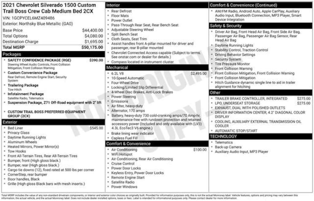 **APPLE CAR PLAY**, **Bluetooth, Hands-Free**, **Rear Backup Camera**, 1st oil change free with purchase, 2 Key Fobs, All weather floor matts, In-Vehicle Wi-Fi, Remote control start, Stolen vehicle location/ Recovery system, Driver monitoring system, Vehicle Usage Alerts, In-vehicle virtual assistant, Vehicle usage alerts, 170 Amp Alternator, 3.42 Rear Axle Ratio, 3.5 Diagonal Monochromatic Display, 4.2 Diagonal Color Display Driver Info Center, 4G LTE Wi-Fi Hot Spot Capable, Auto-Locking Rear Differential, Automatic Emergency Braking, Bluetooth® For Phone, Chevrolet Connected Access Capable, Color-Keyed Carpeting Floor Covering, Compass, Custom Convenience Package, Deep-Tinted Glass, Electric Rear-Window Defogger, Electronic Cruise Control, EZ Lift Power Lock & Release Tailgate, Forward Collision Alert, Front Pedestrian Braking, Front Rubberized Vinyl Floor Mats, Heavy-Duty Air Filter, High Gloss Black Grille, Hill Descent Control, Hitch Guidance, Infotainment Package, LED Cargo Area Lighting, Manual Tilt Wheel Steering Column, OnStar & Chevrolet Connected Services Capable, Performance Red Recovery Hooks, Power Door Locks, Power Front Windows w/Driver Express Up/Down, Power Front Windows w/Passenger Express Down, Power Rear Windows w/Express Down, Preferred Equipment Group 2CX, Rear 60/40 Folding Bench Seat (Folds Up), Rear Rubberized-Vinyl Floor Mats, Remote Keyless Entry, Remote Vehicle Starter System, Safety Confidence Package, SiriusXM Radio, Standard Tailgate, Steering Wheel Audio Controls, Suspension Package, Theft Deterrent System (Unauthorized Entry), Trailering Package, Wheels: 18 x 8.5 Black Painted Aluminum, 4-Wheel Disc Brakes, 40/20/40 Front Split Bench Seat, 6 Speakers, ABS brakes, Air Conditioning, Alloy wheels, AM/FM radio: SiriusXM, Apple CarPlay/Android Auto, Automatic Stop/Start, Auxiliary External Transmission Oil Cooler, Brake assist, Chevytec Spray-On Black Bedliner, Cloth Seat Trim, Delay-off headlights, Driver door bin, Driver vanity mirror, Dual Exhaust w/Polished Outlets, Dual front impact airbags, Dual front side impact airbags, Electronic Stability Control, Front anti-roll bar, Front Center Armrest w/Storage, Front reading lights, Front wheel independent suspension, Fully automatic headlights, Heated door mirrors, Illuminated entry, Integrated Trailer Brake Controller, Low tire pressure warning, Occupant sensing airbag, Off-Road Suspension w/2 Lift, Outside temperature display, Overhead airbag, Overhead console, Panic alarm, Passenger door bin, Passenger vanity mirror, Polished Exhaust Tip, Power door mirrors, Power steering, Power windows, Premium audio system: Chevrolet Infotainment 3, Radio data system, Radio: Chevrolet Infotainment 3 System, Rear reading lights, Rear step bumper, Rear window defroster, Remote keyless entry, Security system, Single-Zone Manual/Semi-Automatic Air Conditioning, Speed control, Speed-sensing steering, Split folding rear seat, Tachometer, Tilt steering wheel, Traction control, Trip computer, Underseat Storage (LPO), Variably intermittent wipers, Voltmeter, 170 Amp Alternator, 3.42 Rear Axle Ratio, 3.5 Diagonal Monochromatic Display, 4.2 Diagonal Color Display Driver Info Center, 4G LTE Wi-Fi Hot Spot Capable, Auto-Locking Rear Differential, Automatic Emergency Braking, Bluetooth® For Phone, Chevrolet Connected Access Capable, Color-Keyed Carpeting Floor Covering, Compass, Custom Convenience Package, Deep-Tinted Glass, Electric Rear-Window Defogger, Electronic Cruise Control, EZ Lift Power Lock & Release Tailgate, Forward Collision Alert, Front Pedestrian Braking, Front Rubberized Vinyl Floor Mats, Heavy-Duty Air Filter, High Gloss Black Grille, Hill Descent Control, Hitch Guidance, Infotainment Package, LED