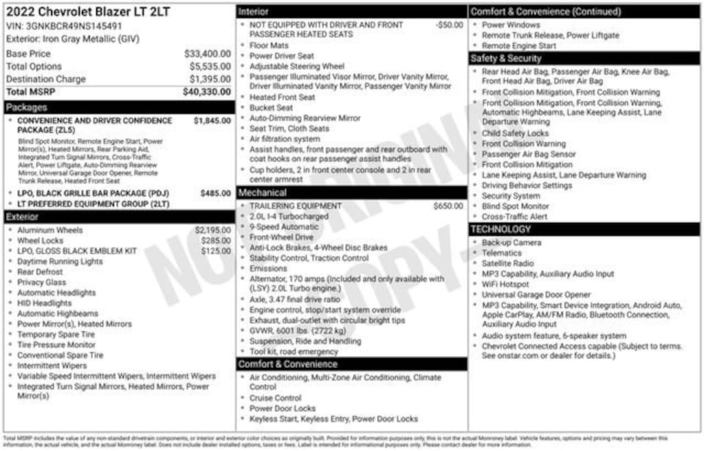 Recent Arrival! CARFAX One-Owner.*** WE DELIVER ***Iron Gray Metallic 2022 Chevrolet Blazer LT 4D Sport Utility 2.0L Turbocharged 9-Speed Automatic with Overdrive FWD172 point inspection certified, 1st oil change free with purchase, Heated Seats, In-Vehicle Wi-Fi, Remote control start, Stolen vehicle location/ Recovery system, Driver monitoring system, Vehicle Usage Alerts, In-vehicle virtual assistant, Vehicle usage alerts, 170 Amp Alternator, 3.47 Final Drive Axle Ratio, 4-Wheel Disc Brakes, 6 Speakers, 6-Speaker Audio System Feature, ABS brakes, Air Conditioning, Alloy wheels, AM/FM radio: SiriusXM, Apple CarPlay/Android Auto, Auto High-beam Headlights, Automatic temperature control, Black Grille Bar LPO), Black Grille Bar Package (LPO), Black Lug Nut & Wheel Lock Kit (LPO), Black Roof Rails, Brake assist, Bumpers: body-color, Chevy Black w/Black Bowtie Outline Wheel Center Caps, Child-Seat-Sensing Airbag, Compass, Convenience & Driver Confidence Package, Delay-off headlights, Driver door bin, Driver vanity mirror, Dual front impact airbags, Dual front side impact airbags, Electronic Stability Control, Emergency communication system: OnStar and Chevrolet connected services capable, Exterior Parking Camera Rear, Four wheel independent suspension, Front & Rear Black Bowties, Front anti-roll bar, Front Bucket Seats, Front Center Armrest, Front dual zone A/C, Front reading lights, Fully automatic headlights, Gloss Black Emblem Kit (LPO), Heated door mirrors, Heated Driver & Front Passenger Seats, High-Intensity Discharge Headlights, Hitch Guidance, Illuminated entry, Inside Rear-View Auto-Dimming Mirror, Knee airbag, Lane Change Alert w/Side Blind Zone Alert, Leather Shift Knob, Low tire pressure warning, Not Equipped w/Driver & Fr Passenger Heated Seats, Occupant sensing airbag, Outside Heated Power-Adjustable Body-Color Mirrors, Outside temperature display, Overhead airbag, Overhead console, Panic alarm, Passenger door bin, Passenger vanity mirror, Power door mirrors, Power driver seat, Power steering, Power windows, Preferred Equipment Group 2LT, Premium Cloth Seat Trim, Radio data system, Radio: Chevrolet Infotainment 3 System, Rear anti-roll bar, Rear Cross Traffic Alert, Rear Park Assist w/Audible Warning, Rear Power Programmable Liftgate, Rear reading lights, Rear seat center armrest, Rear window defroster, Rear window wiper, Remote keyless entry, Remote Start, Ride & Handling Suspension, Security system, SiriusXM Radio, Speed control, Speed-sensing steering, Split folding rear seat, Spoiler, Steering wheel mounted audio controls, Tachometer, Telescoping steering wheel, Tilt steering wheel, Traction control, Trailering Equipment, Trip computer, Universal Home Remote, Variably intermittent wipers, Voltmeter, Wheels: 18 Bright Silver Aluminum, Wheels: 20 Gloss Black Aluminum (LPO), Wheels: 20 Transit, 170 Amp Alternator, 3.47 Final Drive Axle Ratio, 4-Wheel Disc Brakes, 6 Speakers, 6-Speaker Audio System Feature, ABS brakes, Air Conditioning, Alloy wheels, AM/FM radio: SiriusXM, Apple CarPlay/Android Auto, Auto High-beam Headlights, Automatic temperature control, Black Grille Bar LPO), Black Grille Bar Package (LPO), Black Lug Nut & Wheel Lock Kit (LPO), Black Roof Rails, Brake assist, Bumpers: body-color, Chevy Black w/Black Bowtie Outline Wheel Center Caps, Child-Seat-Sensing Airbag, Compass, Convenience & Driver Confidence Package, Delay-off headlights, Driver door bin, Driver vanity mirror, Dual front impact airbags, Dual front side impact airbags, Electronic Stability Control, Emergency communication system: OnStar and Chevrolet connected services capable, Exterior Parking Camera Rear, Four wheel independent suspension, Front & Rear Black Bowties, Front anti-roll bar, Front Bucket Seats, Front Center Armrest, Front dual zone A/C, Front reading lights, Fully automatic headlights, Gloss Black Emblem Kit (LPO), Heated door mirrors, Heated Driver & Front Passenger Seats, High-Intensity Disch
