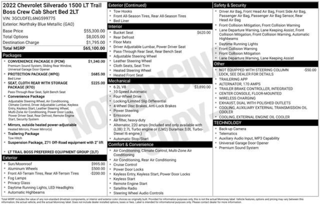 ** 2 KEYS / FOBS**, **APPLE CAR PLAY**, **Rear Backup Camera**, **Heated Seats**, 1st oil change free with purchase, 2 Key Fobs, All weather floor matts, Heated Seats, In-Vehicle Wi-Fi, Remote control start, Stolen vehicle location/ Recovery system, Driver monitoring system, Vehicle Usage Alerts, In-vehicle virtual assistant, Vehicle usage alerts, 10-Way Power Driver Seat w/Lumbar, 12.3 Multicolor Reconfigurable Digital Display, 120-Volt Bed Mounted Power Outlet, 120-Volt Instrument Panel Power Outlet, 2 USB Data Ports, 220 Amp Alternator, 3.42 Rear Axle Ratio, 6-Speaker Audio System, All-Weather Floor Liner (LPO) (AAK), Apple CarPlay/Android Auto, Auto-Locking Rear Differential, Bluetooth® For Phone, Chevrolet Connected Access Capable, Chevytec Spray-On Black Bedliner, Cloth Rear Seat w/Storage Package, Color-Keyed Carpeting Floor Covering, Compass, Convenience Package, Convenience Package II, Deep-Tinted Glass, Dual Exhaust w/Polished Outlets, Dual Rear USB Ports (Charge Only), Dual-Zone Automatic Climate Control, Electric Rear-Window Defogger, Electrical Steering Column Lock, Electronic Cruise Control, Electronic Transmission Range Selector Shifter, EZ Lift Power Lock & Release Tailgate, Floor Mounted Center Console, Front Bucket Seats, Front LED Fog Lamps, HD Rear Vision Camera, Heated Driver & Front Outboard Passenger Seats, Heated front seats, Heated Power-Adjustable Outside Mirrors, Heated Steering Wheel, Heated steering wheel, Heavy-Duty Air Filter, High Gloss Black Mirror Caps, Hill Descent Control, Hitch Guidance, Hitch Guidance w/Hitch View, Inside Rear-View Mirror w/Tilt, Integrated Trailer Brake Controller, Keyless Open & Start, Leather Wrapped Steering Wheel, LED Cargo Area Lighting, Manual Tilt/Telescoping Steering Column, OnStar & Chevrolet Connected Services Capable, Performance Red Recovery Hooks, Power Front Windows w/Driver Express Up/Down, Power Front Windows w/Passenger Express Down, Power Rear Windows w/Express Down, Power Sliding Rear Window w/Rear Defogger, Power Sunroof, Preferred Equipment Group 2LT, Premium Bose 7-Speaker Sound System, Protection Package, Rear 60/40 Folding Bench Seat (Folds Up), Rear Wheelhouse Liners, Remote Vehicle Starter System, SiriusXM w/360L, Standard Tailgate, Steering Wheel Audio Controls, Suspension Package, Theft Deterrent System (Unauthorized Entry), Trailering App, Trailering Package, Universal Home Remote, Wheels: 20 x 9 High Gloss Black Painted Alum, Wi-Fi Hot Spot Capable, Wireless Charging, Wireless Phone Projection, 170 Amp Alternator, 4-Wheel Disc Brakes, 40/20/40 Front Split-Bench Seat, 6 Speakers, ABS brakes, Air Conditioning, AM/FM radio: SiriusXM with 360L, Auto High-beam Headlights, Automatic Emergency Braking, Automatic temperature control, Auxiliary External Transmission Oil Cooler, Brake assist, Cloth Seat Trim, Delay-off headlights, Driver door bin, Driver vanity mirror, Dual front impact airbags, Dual front side impact airbags, Electronic Stability Control, External Engine Oil Cooler, Following Distance Indicator, Forward Collision Alert, Front anti-roll bar, Front Center Armrest w/Storage, Front dual zone A/C, Front fog lights, Front Pedestrian Braking, Front reading lights, Front wheel independent suspension, Fully automatic headlights, Heated door mirrors, Illuminated entry, IntelliBeam Automatic High Beam On/Off, Lane Keep Assist w/Lane Departure Warning, Low tire pressure warning, Not Equipped w/Steering Column Lock, Occupant sensing airbag, Outside temperature display, Overhead airbag, Overhead console, Panic alarm, Passenger door bin, Passenger vanity mirror, Power door mirrors, Power driver seat, Power steering, Power windo