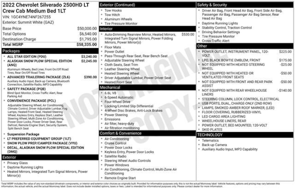 CARFAX One-Owner. Clean CARFAX. Odometer is 14955 miles below market average!*** WE DELIVER ***Summit White 2022 Chevrolet Silverado 2500HD LT 4D Crew Cab 6.6L V8 6-Speed Automatic 4WD**APPLE CAR PLAY**, **Rear Backup Camera**, **Heated Seats**, 1st oil change free with purchase, 2 Key Fobs, All weather floor matts, Heated Seats, In-Vehicle Wi-Fi, Remote control start, Stolen vehicle location/ Recovery system, Driver monitoring system, Vehicle Usage Alerts, In-vehicle virtual assistant, Vehicle usage alerts, 10-Way Power Driver Seat Adjuster w/Lumbar, 12-Volt Rear Auxiliary Power Outlet, 170 Amp Alternator, 2 USB Ports (1st Row), 2 USB Ports & 1 SD Card Reader (1st Row), 2-Speed Electronic Shift Transfer Case, 3.73 Rear Axle Ratio, 4-Way Manual Driver Seat Adjuster, 4.2 Diagonal Color Display Driver Info Center, 6-Speaker Audio System, 720 Cold-Cranking Amps Heavy-Duty Battery, Advanced Trailering Package, Advanced Trailering System, Alaskan Snow Plow Special Edition, Alaskan Snow Plow Special Edition Decal, All Star Edition, Black Chevytec Spray-On Bedliner w/Chevrolet Logo, Black Mirror Caps, Bluetooth® For Phone, Chevrolet Connected Access Capable, Chrome Front Grille, Color-Keyed Carpeting Floor Covering, Compass, Convenience Package, Deep-Tinted Glass, Dual Charge-Only USB Ports (2nd Row), Dual-Zone Automatic Climate Control, Electric Rear-Window Defogger, Electrical Lock Control Steering Column, Electronic Cruise Control w/Set & Resume Speed, EZ Lift Power Lock & Release Tailgate, Front 40/20/40 Split-Bench Seats w/Lockable Storage, Front LED Fog Lamps, Front Rubberized Vinyl Floor Mats, Gooseneck/5th Wheel Package, Gooseneck/5th Wheel Prep Package, Halogen Reflector Headlamps, HD Rear Vision Camera, Heated Driver & Front Outboard Passenger Seating, Heated Steering Wheel, Heated Vertical Trailering Mirrors, Hitch Guidance w/Hitch View, Integrated Trailer Brake Controller, Keyless Open & Start, Lane Change Alert w/Side Blind Zone Alert, Leather-Wrapped Steering Wheel, LED Cargo Area Lighting, LED Smoked Amber Roof Marker Lamps, Manual Tilt & Telescoping Steering Column, Manual Tilt-Wheel Steering Column, OnStar & Chevrolet Connected Services Capable, Power Door Locks, Power Front Windows w/Driver Express Up/Down, Power Front Windows w/Passenger Express Down, Power Rear Windows w/Express Down, Preferred Equipment Group 1LT, Radio: Chevrolet Infotainment 3 Plus System, Rear 60/40 Folding Bench Seat (Folds Up), Rear Cross Traffic Alert, Rear Rubberized Vinyl Floor Mats, Rear Vision Camera, Rear Wheelhouse Liners, Remote Keyless Entry, Remote Vehicle Starter System, Rubberized-Vinyl Floor Covering, Safety Package, SiriusXM Radio, SiriusXM w/360L, Snow Plow Prep/Camper Package, Standard Tailgate, Steering Wheel Audio Controls, Suspension Package, Ultrasonic Front & Rear Park Assist, Unauthorized Entry Theft-Deterrent System, Urethane Steering Wheel, Wheels: 18 High Gloss Black Aluminum, Wi-Fi Hotspot Capable, Wireless Phone Projection, 120-Volt Bed Mounted Power Outlet, 120-Volt Instrument Panel Power Outlet, 4-Wheel Disc Brakes, 6 Speakers, ABS brakes, Air Conditioning, Alloy wheels, AM/FM radio: SiriusXM, Apple CarPlay/Android Auto, Auto-Dimming Inside Rear-View Mirror, Brake assist, Bumpers: chrome, Cloth Seat Trim, Delay-off headlights, Driver door bin, Driver vanity mirror, Dual front impact airbags, Dual front side impact airbags, Electronic Stability Control, Front 40/20/40 Split-Bench Seats, Front anti-roll bar, Front Black Bowtie Emblem (LPO), Front Center Armrest w/Storage, Front reading lights, Front wheel independent suspension, Fully automatic headlights, Heated & Auto-Dimming Vertical Trailering Mirrors, Heated door mirrors, Illuminated entry, Low tire pressure warning, Not Equipped w/Driver & Fr Passenger Heated Seats, Not Equipped w/Front & Rear Park Assist, Not Equipped w/Rear Wheelhouse Liners, Occupant sensing airbag, Outside temperature display, Overhead airbag, Overhead conso