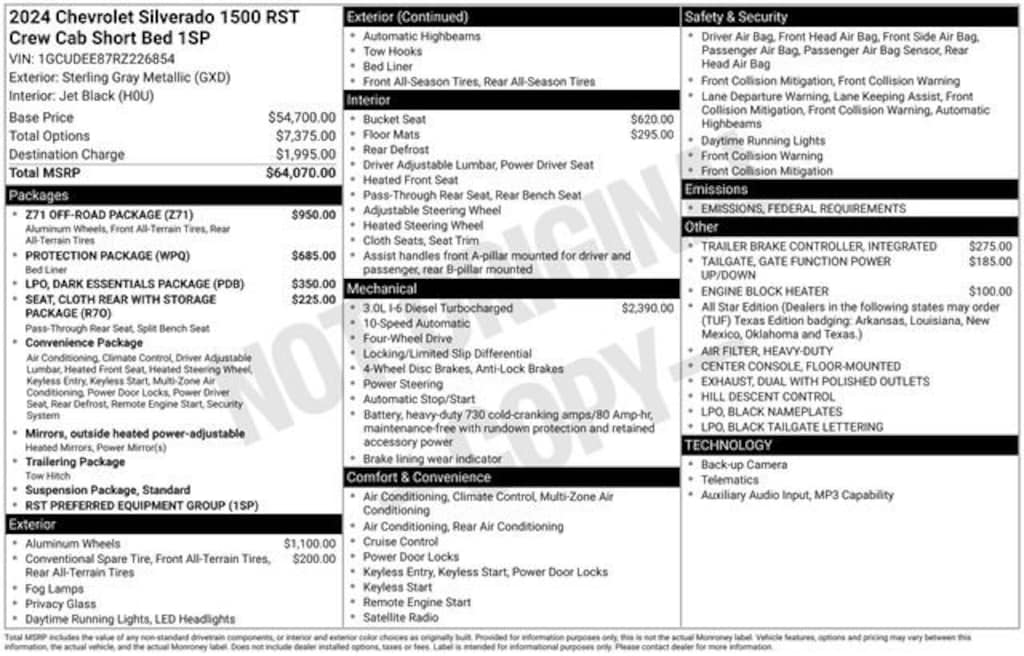 10-Way Power Driver Seat w/Lumbar, 12.3 Multicolor Reconfigurable Digital Display, 120-Volt Bed Mounted Power Outlet, 120-Volt Interior Power Outlet, 2 USB Data Ports, 220 Amp Alternator, 3.23 Rear Axle Ratio, 4-Wheel Disc Brakes, 40/20/40 Front Split-Bench Seat, 6 Speakers, 6-Speaker Audio System, ABS brakes, Air Conditioning, All-Star Edition, All-Weather Floor Liner (LPO) (AAK), Alloy wheels, AM/FM radio: SiriusXM with 360L, Auto High-beam Headlights, Auto-Locking Rear Differential, Automatic Emergency Braking, Automatic temperature control, Black Name Plates (LPO), Black Tailgate CHEVROLET Lettering (LPO), Bluetooth® For Phone, Brake assist, Bumpers: body-color, Chevrolet Connected Access Capable, Chevytec Spray-On Black Bedliner, Cloth Rear Seat w/Storage Package, Cloth Seat Trim, Color-Keyed Carpeting Floor Covering, Compass, Convenience Package, Dark Essentials Package (LPO), Deep-Tinted Glass, Delay-off headlights, Driver door bin, Driver vanity mirror, Dual Exhaust w/Polished Outlets, Dual front impact airbags, Dual front side impact airbags, Dual Rear USB Ports (Charge Only), Dual-Zone Automatic Climate Control, Electric Rear-Window Defogger, Electrical Steering Column Lock, Electronic Cruise Control, Electronic Stability Control, Electronic Transmission Range Selector Shifter, Engine Block Heater, EZ Lift Power Lock & Release Tailgate, Floor Mounted Center Console, Following Distance Indicator, Forward Collision Alert, Front anti-roll bar, Front Bucket Seats, Front Center Armrest w/Storage, Front dual zone A/C, Front fog lights, Front Frame-Mounted Black Recovery Hooks, Front LED Fog Lamps, Front Pedestrian Braking, Front reading lights, Front Rubberized Vinyl Floor Mats, Front wheel independent suspension, Fully automatic headlights, HD Rear Vision Camera, Heated door mirrors, Heated Driver & Front Outboard Passenger Seats, Heated front seats, Heated Power-Adjustable Outside Mirrors, Heated Steering Wheel, Heated steering wheel, Heavy-Duty Air Filter, High Gloss Black Mirror Caps, Hill Descent Control, Hitch Guidance, Illuminated entry, Inside Rear-View Mirror w/Tilt, Integrated Trailer Brake Controller, IntelliBeam Automatic High Beam On/Off, Keyless Open & Start, Lane Keep Assist w/Lane Departure Warning, LED Cargo Area Lighting, Low tire pressure warning, Occupant sensing airbag, Off-Road Suspension, OnStar & Chevrolet Connected Services Capable, Outside temperature display, Overhead airbag, Overhead console, Panic alarm, Passenger door bin, Passenger vanity mirror, Power door mirrors, Power driver seat, Power Front Windows w/Driver Express Up/Down, Power Front Windows w/Passenger Express Down, Power Rear Windows w/Express Down, Power steering, Power Tailgate, Power windows, Preferred Equipment Group 1SP, Premium audio system: Chevrolet Infotainment 3 Premium, Protection Package, Radio data system, Radio: Chevrolet Infotainment 3 Premium System, Rear 60/40 Folding Bench Seat (Folds Up), Rear reading lights, Rear Rubberized-Vinyl Floor Mats, Rear step bumper, Rear Wheelhouse Liners, Rear window defroster, Remote keyless entry, Remote Vehicle Starter System, Security system, Single Outlet Exhaust, SiriusXM w/360L, Speed control, Speed-sensing steering, Split folding rear seat, Standard Suspension Package, Standard Tailgate, Steering Wheel Audio Controls, Steering wheel mounted audio controls, Tachometer, Telescoping steering wheel, Theft Deterrent System (Unauthorized Entry), Tilt steering wheel, Traction control, Trailering Package, Trip computer, Variably intermittent wipers, Voltmeter, Wheels: 18 x 8.5 Bright Silver Painted Aluminum, Wheels: 20 x 9 High Gloss Black Painted Alum, Wi-Fi Hot Spot Capable, Wireless Charging, Wrapped Steering Wheel, Z71 Off-Road Package.