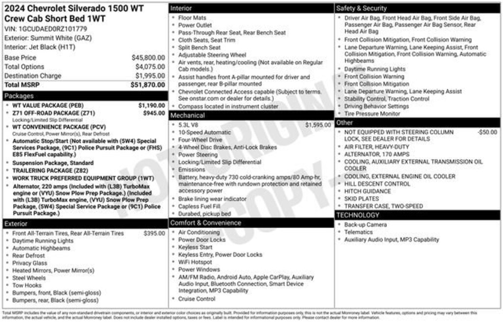 Recent Arrival! CARFAX One-Owner. Clean CARFAX.*** WE DELIVER ***Summit White 2024 Chevrolet Silverado 1500 WT 4D Crew Cab EcoTec3 5.3L V8 10-Speed Automatic 4WD170 Amp Alternator, 220 Amp Alternator, 3.5 Monochromatic Display Driver Info Center, 4-Wheel Disc Brakes, 40/20/40 Front Split-Bench Seat, 6 Speakers, 6-Speaker Audio System, ABS brakes, Air Conditioning, Auto High-beam Headlights, Auto-Locking Rear Differential, Automatic Emergency Braking, Auxiliary External Transmission Oil Cooler, Black (Semi-Gloss) Front Bumper, Black (Semi-Gloss) Rear Bumper, Black Manual Outside Mirrors, Bluetooth® For Phone, Brake assist, Chevrolet Connected Access Capable, Compass, Deep-Tinted Glass, Delay-off headlights, Driver door bin, Dual front impact airbags, Dual front side impact airbags, Electric Rear-Window Defogger, Electrical Steering Column Lock, Electronic Cruise Control, Electronic Stability Control, External Engine Oil Cooler, Following Distance Indicator, Forward Collision Alert, Front anti-roll bar, Front Center Armrest w/Storage, Front Frame-Mounted Black Recovery Hooks, Front Pedestrian Braking, Front reading lights, Front wheel independent suspension, Fully automatic headlights, HD Rear Vision Camera, Heated Power-Adjustable Outside Mirrors, Heavy-Duty Air Filter, Hill Descent Control, Hitch Guidance, Illuminated entry, Inside Rear-View Mirror w/Tilt, IntelliBeam Automatic High Beam On/Off, Lane Keep Assist w/Lane Departure Warning, Locking Tailgate, Low tire pressure warning, Manual Tailgate Function w/No EZ Lift, Manual Tilt Wheel Steering Column, Not Equipped w/Steering Column Lock, Occupant sensing airbag, Off-Road Suspension, OnStar & Chevrolet Connected Services Capable, Outside temperature display, Overhead airbag, Overhead console, Panic alarm, Passenger door bin, Passenger vanity mirror, Power Front Windows w/Driver Express Up/Down, Power Front Windows w/Passenger Express Down, Power Rear Windows w/Express Down, Power steering, Power windows, Preferred Equipment Group 1WT, Premium audio system: Chevrolet Infotainment 3, Radio data system, Radio: Chevrolet Infotainment 3 System, Rear 60/40 Folding Bench Seat (Folds Up), Rear reading lights, Rear step bumper, Remote Keyless Entry, Remote keyless entry, Rubberized-Vinyl Floor Covering, SiriusXM Delete, Solar Absorbing Tinted Glass, Speed-sensing steering, Split folding rear seat, Standard Suspension Package, Standard Tailgate, Tachometer, Tilt steering wheel, Traction control, Trailering Package, Trip computer, Variably intermittent wipers, Vinyl Seat Trim, Voltmeter, Wheels: 17 x 8 Ultra Silver Painted Steel, Wi-Fi Hot Spot Capable, WT Convenience Package, WT Value Package, Z71 Off-Road Package.