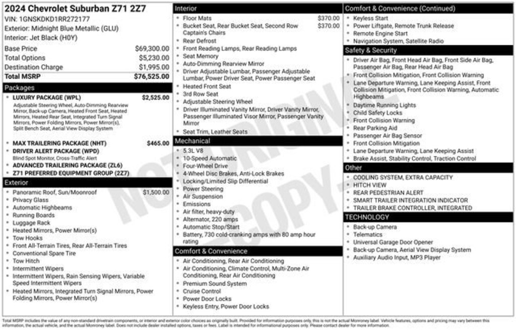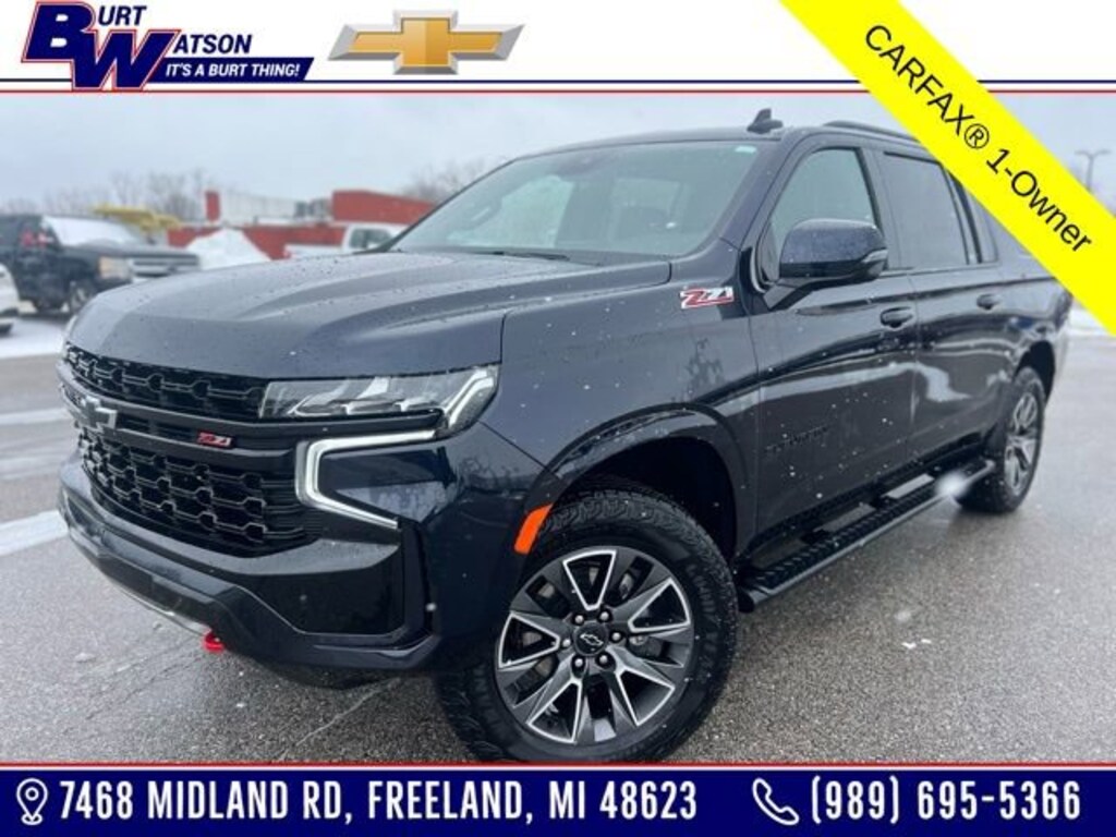 Recent Arrival! CARFAX One-Owner. Clean CARFAX.*** WE DELIVER ***Midnight Blue Metallic 2024 Chevrolet Suburban Z71 4D Sport Utility EcoTec3 5.3L V8 10-Speed Automatic with Overdrive 4WD10-Way Power Driver & Passenger Seat Adjusters, 1st & 2nd Row Color-Keyed Carpeted Floor Mats, 1st, 2nd & 3rd Row All-Weather Floor Liners (LPO), 2-Speed Active Electronic AutoTrac Transfer Case, 2nd Row Pwr Release 60/40 Split-Folding Bench Seat, 3.23 Rear Axle Ratio, 3rd Row 60/40 Power-Folding Split-Bench, 3rd row seats: split-bench, 4-Wheel Disc Brakes, 9 Speakers, ABS brakes, Advanced Trailering Package, Air Conditioning, Alloy wheels, AM/FM radio: SiriusXM with 360L, Apple CarPlay/Android Auto, Auto High-beam Headlights, Auto-Dimming Inside Rear-View Mirror, Auto-dimming Rear-View mirror, Automatic temperature control, Black Tubular Assist Steps, Bose 9-Speaker Stereo Audio System Feature, Brake assist, Bright Front & Rear Door Sill Plates, Bumpers: body-color, Color-Keyed Carpeting Floor Covering, Compass, Delay-off headlights, Driver & Front Outboard Passenger Airbags, Driver Alert Package, Driver door bin, Driver vanity mirror, Dual front impact airbags, Dual front side impact airbags, Dual-Pane Power Panoramic Sunroof, Electronic Stability Control, Emergency communication system: OnStar and Chevrolet connected services capable, Enhanced Driver Information Center, Extra Capacity Cooling System, Floor Console w/Storage Area, Four wheel independent suspension, Front anti-roll bar, Front Bucket Seats, Front Center Armrest, Front dual zone A/C, Front High-Approach Angle Fascia, Front reading lights, Fully automatic headlights, Garage door transmitter, Hands-Free Rear Power Programmable Liftgate, HD Surround Vision, Heated 2nd Row Outboard Seats, Heated door mirrors, Heated Driver & Front Passenger Seats, Heated front seats, Heated Steering Wheel, Heavy-Duty Air Filter, Hill Descent Control, Hitch View w/Pan/Zoom Image Adjustment, Illuminated entry, Infotainment Display, Integrated Trailer Brake Controller, Lane Change Alert w/Side Blind Zone Alert, Leather-Appointed Seating, LED Daytime Running Lamps, Low tire pressure warning, Luxury Package, Max Trailering Package, Memory seat, Memory Settings, Memory Settings For Driver, Navigation System, Occupant sensing airbag, Outside Heated Power-Adjustable Mirrors, Outside temperature display, Overhead airbag, Overhead console, Panic alarm, Passenger door bin, Passenger vanity mirror, Power door mirrors, Power driver seat, Power Liftgate, Power passenger seat, Power Release 2nd Row Bucket Seats, Power steering, Power Tilt & Telescopic Steering Column, Power windows, Preferred Equipment Group 2Z7, Premium audio system: Chevrolet Infotainment 3 Premium, Premium Smooth Ride Suspension, Radio: Chevrolet Infotainment 3 Premium System, Rain sensing wipers, Rear air conditioning, Rear anti-roll bar, Rear Cross Traffic Alert, Rear Pedestrian Alert, Rear reading lights, Rear seat center armrest, Rear window defroster, Rear window wiper, Red Recovery Hooks, Remote keyless entry, Remote Start, Roof rack: xxxxxx, Security system, SiriusXM w/360L, Smart Trailer Integration Indicator, Speed control, Speed-sensing steering, Split folding rear seat, Spoiler, Steering wheel mounted audio controls, Tachometer, Telescoping steering wheel, Tilt steering wheel, Traction control, Trip computer, Universal Home Remote, Variably intermittent wipers, Voltmeter, Wheels: 20 x 9 Machined Aluminum, Wireless Charging, Wrapped Steering Wheel.