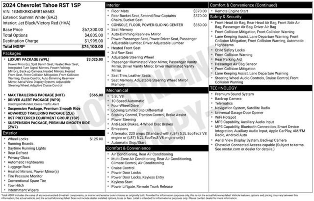 Recent Arrival! CARFAX One-Owner. Clean CARFAX.*** WE DELIVER ***Summit White 2024 Chevrolet Tahoe RST 4D Sport Utility EcoTec3 5.3L V8 10-Speed Automatic with Overdrive 4WD**Leather Seats**, **ONE OWNER**, **Rear Backup Camera**, 172 point inspection certified, 1st oil change free with purchase, All weather floor matts, Heated Seats, In-Vehicle Wi-Fi, Remote control start, Stolen vehicle location/ Recovery system, Driver monitoring system, Vehicle Usage Alerts, In-vehicle virtual assistant, Vehicle usage alerts, 10-Way Power Driver & Passenger Seat Adjusters, 1st & 2nd Row Color-Keyed Carpeted Floor Mats, 1st, 2nd & 3rd Rows All-Weather Floor Liners (LPO), 2 USB Data Ports in Center Console Delete, 2-Speed Active Electronic AutoTrac Transfer Case, 2nd Row Pwr Release 60/40 Split-Folding Bench Seat, 3.23 Rear Axle Ratio, 3rd Row 60/40 Power-Folding Split-Bench Seat, 3rd row seats: split-bench, 4-Wheel Disc Brakes, 9 Speakers, ABS brakes, Adaptive Cruise Control, Advanced Trailering Package, Air Conditioning, Alloy wheels, AM/FM radio: SiriusXM with 360L, Apple CarPlay/Android Auto, Auto High-beam Headlights, Auto-Dimming Inside Rear-View Mirror, Auto-dimming Rear-View mirror, Automatic temperature control, Bose 9-Speaker Stereo Audio System Feature, Brake assist, Bright Front & Rear Door Sill Plates, Bumpers: body-color, Color-Keyed Carpeting Floor Covering, Compass, Delay-off headlights, Driver & Front Outboard Passenger Airbags, Driver Alert Package, Driver door bin, Driver vanity mirror, Dual front impact airbags, Dual front side impact airbags, Electronic Stability Control, Emergency communication system: OnStar and Chevrolet connected services capable, Enhanced Automatic Emergency Braking, Enhanced Driver Information Center, Extra Capacity Cooling System, Floor Console, Floor Console w/Storage Area, Four wheel independent suspension, Front anti-roll bar, Front Bucket Seats, Front Center Armrest, Front dual zone A/C, Front High-Back Reclining Bucket Seats, Front reading lights, Fully automatic headlights, Garage door transmitter, Hands-Free Rear Power Programmable Liftgate, HD Surround Vision, Heated 2nd Row Outboard Seats, Heated door mirrors, Heated Driver & Front Passenger Seats, Heated front seats, Heated Steering Wheel, Hitch View w/Pan/Zoom Image Adjustment, Illuminated entry, Infotainment Display, Integrated Trailer Brake Controller, Lane Change Alert w/Side Blind Zone Alert, LED Daytime Running Lamps, Low tire pressure warning, Luxury Package, Max Trailering Package, Memory seat, Memory Settings, Memory Settings for Driver, Navigation System, Occupant sensing airbag, Outside Heated Power-Adjustable Mirrors, Outside temperature display, Overhead airbag, Overhead console, Panic alarm, Passenger door bin, Passenger vanity mirror, Perforated Leather Seat Trim, Power door mirrors, Power driver seat, Power Liftgate, Power passenger seat, Power Release 2nd Row Bucket Seats, Power steering, Power Tilt & Telescopic Steering Column, Power windows, Preferred Equipment Group 1SP, Premium audio system: Chevrolet Infotainment 3 Premium, Premium Smooth Ride Suspension, Radio: Chevrolet Infotainment 3 Premium System, Rain sensing wipers, Rear air conditioning, Rear anti-roll bar, Rear Cross Traffic Alert, Rear Pedestrian Alert, Rear reading lights, Rear seat center armrest, Rear window defroster, Rear window wiper, Remote keyless entry, Remote Start, Roof rack: xxxxxx, Security system, Set of 4 Wheel Locks (LPO), SiriusXM w/360L, Smart Trailer Integration Indicator, Speed control, Speed-sensing steering, Split folding rear seat, Spoiler, Steering wheel mounted audio controls, Tachometer, Telescoping steering wheel, Tilt steering wheel, Traction control, Trip computer, Universal Home Remote, Variably intermittent wipers, Voltmeter, Wheels: 22 x 9 Bright Machined, Wireless Charging, Wrapped Steering Wheel, 10-Way Power Driver & Passenger Seat Adjusters, 1st & 2nd Row Color-Keyed Carpeted Floor Mats, 1st