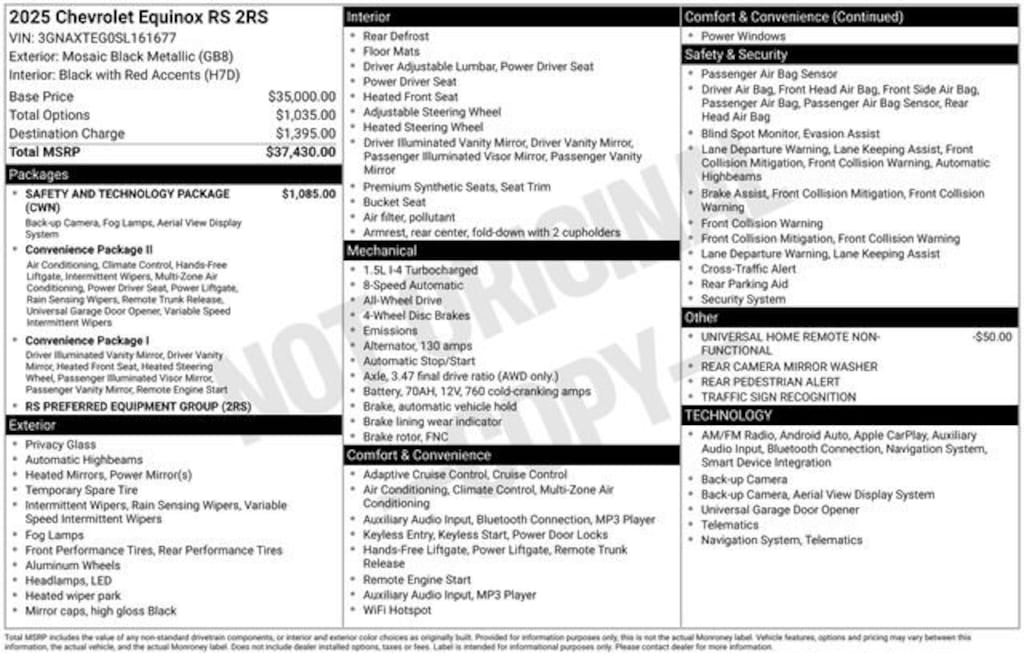 2-Way Power Driver Lumbar Control Seat Adjuster, 3.47 Final Drive Axle Ratio, 4-Wheel Disc Brakes, 6 Speakers, ABS brakes, Air Conditioning, Alloy wheels, AM/FM radio: SiriusXM, Auto High-beam Headlights, Automatic temperature control, Brake assist, Bumpers: body-color, Compass, Delay-off headlights, Driver 8-Way Power Seat Adjuster, Driver door bin, Driver vanity mirror, Dual front impact airbags, Dual front side impact airbags, Electronic Stability Control, Emergency communication system: OnStar and Chevrolet connected services capable, Evotex Seat Trim, Four wheel independent suspension, Front anti-roll bar, Front Bucket Seats, Front Center Armrest, Front dual zone A/C, Front Fog Lamps, Front Passenger 4-Way Manual Seat Adjuster, Front reading lights, Fully automatic headlights, Garage door transmitter, HD Surround Vision, Heated door mirrors, Heated Driver & Front Passenger Seats, Heated front seats, Heated steering wheel, Illuminated entry, Low tire pressure warning, Navigation System, Occupant sensing airbag, Outside temperature display, Overhead airbag, Overhead console, Panic alarm, Passenger door bin, Passenger vanity mirror, Power door mirrors, Power driver seat, Power Liftgate, Power steering, Power windows, Preferred Equipment Group 2RS, Premium audio system: Chevrolet Infotainment 3, Radio data system, Radio: 11.3 Diagonal Advanced Color LCD Display, Rain sensing wipers, Rear anti-roll bar, Rear Camera Mirror Washer, Rear Pedestrian Alert, Rear reading lights, Rear seat center armrest, Rear window defroster, Rear window wiper, Remote keyless entry, Safety & Technology Package, Security system, SiriusXM, Speed control, Speed-sensing steering, Split folding rear seat, Spoiler, Sport steering wheel, Steering wheel mounted audio controls, Tachometer, Telescoping steering wheel, Tilt steering wheel, Traction control, Traffic Sign Recognition, Trip computer, Universal Home Remote Non-Functional, Variably intermittent wipers, Wheels: 19 Carbon Flash Metallic Aluminum.