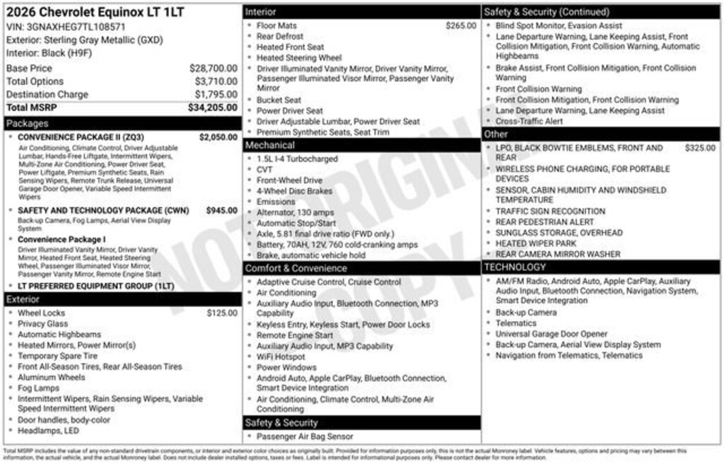 *** WE DELIVER ***Sterling Gray Metallic 2026 Chevrolet Equinox LT 4D Sport Utility FWD 1.5L DOHC CVT2-Way Power Driver Lumbar Control Seat Adjuster, 4-Wheel Disc Brakes, 5.81 Final Drive Axle Ratio, 6 Speakers, ABS brakes, Air Conditioning, All-Weather Floor Liners (LPO), Alloy wheels, AM/FM radio: SiriusXM, Auto High-beam Headlights, AutoSense Hands-Free Power Programmable Liftgate, Brake assist, Bumpers: body-color, Cabin Humidity & Windshield Sensor, Cloth Seat Trim, Compass, Convenience Package II, Delay-off headlights, Driver 6-Way Manual Seat Adjuster, Driver 8-Way Power Seat Adjuster, Driver door bin, Driver vanity mirror, Dual front impact airbags, Dual front side impact airbags, Dual-Zone Automatic Climate Control, Electronic Stability Control, Emergency communication system: OnStar and Chevrolet connected services capable, Evotex Seat Trim, Four wheel independent suspension, Front & Rear Black Bowtie Emblems (LPO), Front anti-roll bar, Front Bucket Seats, Front Center Armrest, Front Fog Lamps, Front Passenger 4-Way Manual Seat Adjuster, Front reading lights, Fully automatic headlights, HD Surround Vision, Heated door mirrors, Heated Driver & Front Passenger Seats, Heated front seats, Heated steering wheel, Heated Wiper Park, Illuminated entry, Intermittent Front Rain-Sensing Wipers, Low tire pressure warning, Navigation System, Occupant sensing airbag, Outside temperature display, Overhead airbag, Overhead console, Overhead Sunglass Storage, Panic alarm, Passenger door bin, Passenger vanity mirror, Power door mirrors, Power steering, Power windows, Preferred Equipment Group 1LT, Premium audio system: Chevrolet Infotainment 3, Programmable Universal Home Remote, Radio data system, Radio: 11.3 Diagonal Advanced Color LCD Display, Rear anti-roll bar, Rear Camera Mirror Washer, Rear Pedestrian Alert, Rear reading lights, Rear seat center armrest, Rear window defroster, Rear window wiper, Remote keyless entry, Safety & Technology Package, Second Row All-Weather Mat (LPO), Security system, Set of 4 Wheel Locks (LPO), SiriusXM w/360L Trial Subscription, Speed control, Speed-sensing steering, Split folding rear seat, Spoiler, Steering wheel mounted audio controls, Tachometer, Telescoping steering wheel, Tilt steering wheel, Traction control, Traffic Sign Recognition, Trip computer, Variably intermittent wipers, Wheels: 17 Grazen Metallic Machined-Face Aluminum, Wireless Phone Charging for Portable Devices.