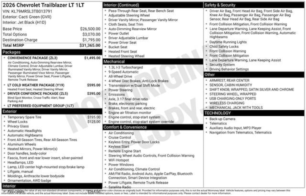 Cacti Green 2026 Chevrolet TrailBlazer LT 4D Sport Utility AWD 1.3L I3 Turbocharged DOHC 12V LEV3-SULEV30 155hp 9-Speed Automatic