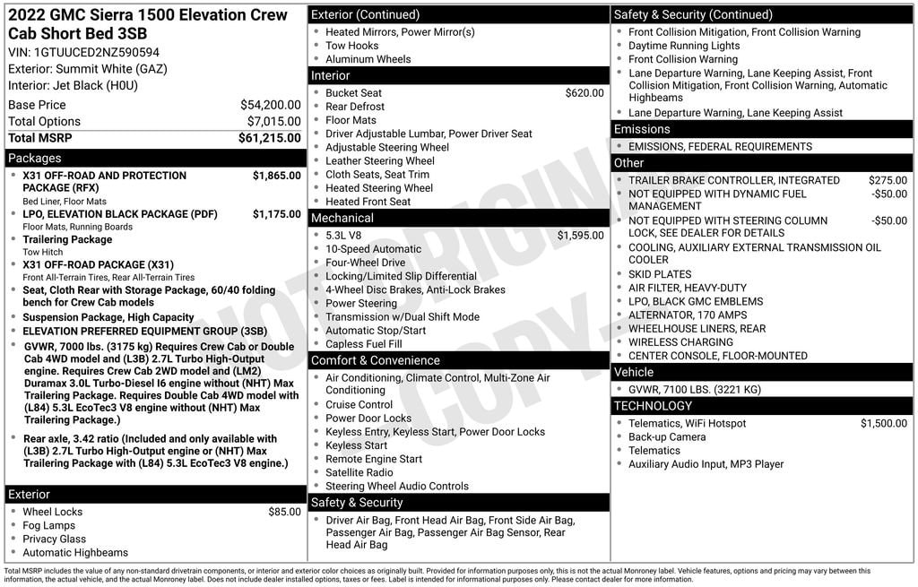 125 point inspection, 10-Way Power Driver Seat Adjuster w/Lumbar, 120-Volt Bed Mounted Power Outlet, 120-Volt Instrument Panel Power Outlet, 170 Amp Alternator, 2 Charge/Data USB Ports, 2 Charge/Data USB Ports Inside Center Console, 2 Type-C Charge-Only Rear USB Ports, 220 Amp Alternator, 3 Years of OnStar & Connected Services Plan, 4-Way Manual Passenger Seat Adjuster, 4-Wheel Disc Brakes, 6 Speakers, 6-Speaker Audio System Feature, 6" Rectangular Black Tubular Assist Steps (LPO), ABS brakes, Air Conditioning, All-Weather Floor Liner (LPO), Alloy wheels, AM/FM radio: SiriusXM with 360L, Apple CarPlay/Android Auto, Auto High-beam Headlights, Auto-Locking Rear Differential, Automatic Emergency Braking, Automatic temperature control, Auxiliary External Transmission Oil Cooler, Black GMC Emblems (LPO), Body Color Header w/Gloss Black Mesh Grille Bars, Brake assist, Buckle to Drive, Bumpers: body-color, Cloth Rear Seat w/Storage Package, Cloth Seat Trim, Color-Keyed Carpeting Floor Covering, Compass, Deep-Tinted Glass, Delay-off headlights, Driver door bin, Driver vanity mirror, Dual Exhaust System, Dual front impact airbags, Dual front side impact airbags, Electric Rear-Window Defogger, Electrical Steering Column Lock, Electronic Precision Shift, Electronic Stability Control, Elevation Black Package (LPO), Emergency communication system: OnStar and GMC Connected Services capable, Exterior Parking Camera Rear, External Engine Oil Cooling, Floor-Mounted Center Console, Following Distance Indicator, Forward Collision Alert, Front 40/20/40 Split-Bench Seat, Front anti-roll bar, Front Bucket Seats, Front Center Armrest w/Storage, Front dual zone A/C, Front fog lights, Front Frame-Mounted Black Recovery Hooks, Front Pedestrian Braking, Front reading lights, Front Rubberized-Vinyl Floor Mats, Front wheel independent suspension, Fully automatic headlights, GMC Connected Access Capable, HD Rear Vision Camera, Heated door mirrors, Heated Driver & Front Outboard Passenger Seating, Heated front seats, Heated Steering Wheel, Heated steering wheel, Heavy-Duty Air Filter, High Capacity Suspension Package, Hill Descent Control, Hitch Guidance, Illuminated entry, Integrated Trailer Brake Controller, IntelliBeam Automatic High Beam On/Off, Keyless Open & Start, Lane Keep Assist w/Lane Departure Warning, LED Cargo Area Lighting, Low tire pressure warning, Manual Tilt-Wheel & Telescoping Steering Column, Navigation System, Not Equipped w/Dynamic Fuel Management, Not Equipped w/Steering Column Lock, Occupant sensing airbag, Off-Road Suspension, OnStar & GMC Connected Services Capable, Outside temperature display, Overhead airbag, Overhead console, Panic alarm, Passenger door bin, Passenger vanity mirror, Power Door Locks, Power door mirrors, Power driver seat, Power Front Windows w/Driver Express Up/Down, Power Front Windows w/Passenger Express Down, Power Rear Windows w/Express Down, Power steering, Power windows, Preferred Equipment Group 3SB, Premium audio system: GMC Infotainment System, Push Button Start, Radio data system, Radio: Premium GMC Infotainment Audio System, Rear reading lights, Rear Rubberized-Vinyl Floor Mats, Rear seat center armrest, Rear step bumper, Rear Wheelhouse Liners, Rear window defroster, Remote keyless entry, Remote Vehicle Starter System, Security system, SiriusXM w/360L, Speed control, Speed-sensing steering, Split folding rear seat, Spray-On Pickup Bed Liner w/GMC Logo, Steering Wheel Audio Controls, Steering wheel mounted audio controls, Tachometer, Telescoping steering wheel, Theft Deterrent System (Unauthorized Entry), Tilt steering wheel, Traction control, Trailering Package, Trip computer, Variably intermittent wipers, Voltmeter, Wheel Locks (Set of 4) (LPO), Wheels: 20" x 9" High Gloss Black Painted Aluminum, Wi-Fi Hotspot Ca