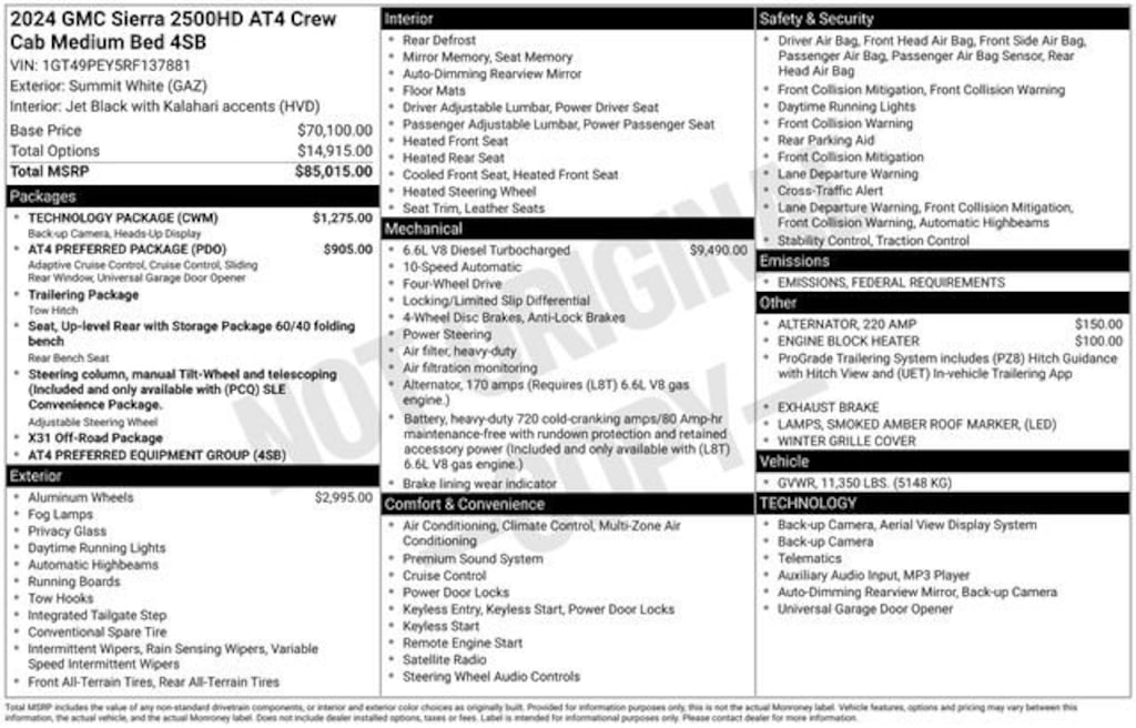 Recent Arrival! Clean CARFAX.*** WE DELIVER ***Summit White 2024 GMC Sierra 2500HD AT4 4D Crew Cab Duramax 6.6L V8 Turbodiesel 10-Speed Automatic 4WD10-Way Power Driver Seat Adjuster w/Lumbar, 10-Way Power Passenger Seat Adjuster w/Lumbar, 120-Volt Bed Mounted Power Outlet, 120-Volt Instrument Panel Power Outlet, 2 Charge-Only Rear USB Ports, 2 Charge/Data USB Ports Inside Center Console, 2 USB Ports, 2-Speed Active Transfer Case, 220-Amp Alternator, 4-Wheel Disc Brakes, 7 Speakers, ABS brakes, Adaptive Cruise Control, Air Conditioning, Alloy wheels, AM/FM radio: SiriusXM with 360L, Apple CarPlay/Android Auto, AT4 Preferred Package, Auto High-beam Headlights, Auto-dimming door mirrors, Auto-dimming Rear-View mirror, Automatic Emergency Braking, Automatic temperature control, Bed View Camera w/2 Trailer Camera Provisions, Bose Premium 7-Speaker Sound System, Brake assist, Buckle to Drive, Bumpers: body-color, Compass, Deep-Tinted Glass, Delay-off headlights, Driver door bin, Driver Memory, Driver vanity mirror, Dual front impact airbags, Dual front side impact airbags, Electric Rear-Window Defogger, Electronic Stability Control, Engine Block Heater, Exhaust Brake, Floor-Mounted Center Console, Following Distance Indicator, Forward Collision Alert, Front anti-roll bar, Front Bucket Seats, Front Center Armrest, Front dual zone A/C, Front fog lights, Front Pedestrian Braking, Front Prem Floor Liners w/Removable Carpet Insert, Front Rain-Sensing Wipers, Front reading lights, Front wheel independent suspension, Fully automatic headlights, Gloss Black Header Grille & Grille Insert Bars, GMC Connected Access Capable, HD Surround Vision, Heated 2nd Row Outboard Seats, Heated door mirrors, Heated Driver & Front Outboard Passenger Seats, Heated front seats, Heated rear seats, Heated steering wheel, Heavy-Duty 80 Amp Battery, Hill Descent Control, Hitch Guidance w/Hitch View, Illuminated entry, In-Vehicle Trailering System App, Inside Rearview Auto-Dimming Rear Camera Mirror, Integrated Trailer Brake Controller, IntelliBeam Automatic High Beam On/Off, Keyless Open & Start, Lane Departure Warning System, LED Cargo Area Lighting, LED Smoked Amber Roof Marker Lamps, Low tire pressure warning, Manual Tilt-Wheel/Telescoping Steering Column, Memory seat, Multicolor 15 Diagonal Head-Up Display, Occupant sensing airbag, Off-Road Suspension, OnStar & GMC Connected Services Capable, Outside temperature display, Overhead airbag, Overhead console, Panic alarm, Passenger door bin, Passenger vanity mirror, Perforated Leather-Appointed Front Seat Trim, Pickup Box, Power door mirrors, Power driver seat, Power Front Passenger Windows w/Express Up/Down, Power passenger seat, Power Sliding Rear Window w/Defogger, Power steering, Power windows, Preferred Equipment Group 4SB, Premium audio system: Premium GMC Infotainment System, Push Button Start, Radio: AM/FM w/Premium GMC Infotainment System, Rain sensing wipers, Rear Cross Traffic Alert, Rear Prem Floor Liners w/Removable Carpet Insert, Rear reading lights, Rear seat center armrest, Rear step bumper, Rear Wheelhouse Liners, Rear window defroster, Remote keyless entry, Remote Vehicle Starter System, Safety Alert Seat, Security system, SiriusXM w/360L, Speed control, Speed-sensing steering, Split folding rear seat, Spray-On Bedliner w/AT4 Logo, Steering Wheel Audio Controls, Steering wheel mounted audio controls, Tachometer, Technology Package, Telescoping steering wheel, Tilt steering wheel, Traction control, Trailer Cam Provisions & Trailer Viewing Software, Trailer Side Blind Zone Alert, Trip computer, Turn signal indicator mirrors, Ultrasonic Front & Rear Park Assist, Unauthorized Entry Theft-Deterrent System, Universal Home Remote, Variably intermittent wipers, Ventilated Driver & Front Passenger Seats, Ventilated front seats, Voltmeter, Wheels: 20 Aluminum High Gloss Black (LPO), Wheels: 20 High Gloss Black 8 Spokes Aluminum, Wheels: 20 Transit Aluminum, Winter Grille C