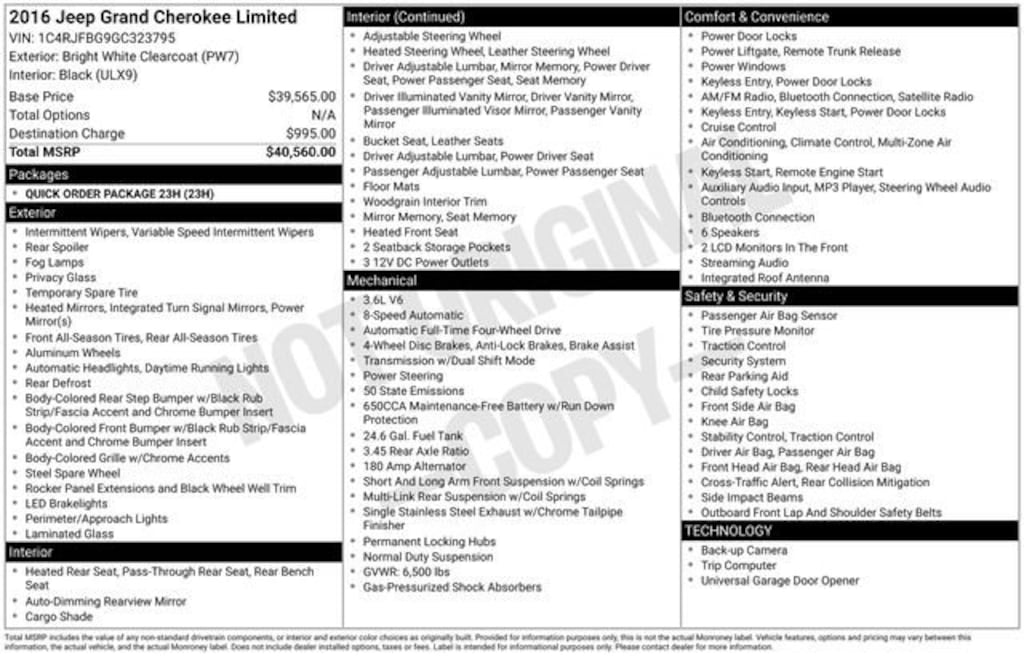 *** WE DELIVER ***Bright White Clearcoat 2016 Jeep Grand Cherokee Limited 4D Sport Utility 3.6L V6 24V VVT 8-Speed Automatic 4WD**Bluetooth, Hands-Free**, **Heated Seats**, 1st oil change free with purchase, 2 Key Fobs, All weather floor matts, Heated Seats, Remote control start, Stolen vehicle location/ Recovery system, Driver monitoring system, Vehicle Usage Alerts, In-vehicle virtual assistant, Vehicle usage alerts, 18 x 8.0 Aluminum Polished Wheels, 3.45 Rear Axle Ratio, Alloy wheels, Engine Oil Cooler, Four wheel independent suspension, Front Bucket Seats, Garage door transmitter, Heated door mirrors, Heated front seats, Heated rear seats, Heated steering wheel, Power passenger seat, Quick Order Package 23H, 4-Wheel Disc Brakes, 6 Speakers, ABS brakes, Air Conditioning, AM/FM radio: SiriusXM, Anti-whiplash front head restraints, Audio memory, Auto-dimming door mirrors, Auto-dimming Rear-View mirror, Automatic temperature control, Brake assist, Bumpers: body-color, Compass, Delay-off headlights, Driver door bin, Driver vanity mirror, Dual front impact airbags, Dual front side impact airbags, Electronic Stability Control, Exterior Parking Camera Rear, Front anti-roll bar, Front Center Armrest w/Storage, Front dual zone A/C, Front fog lights, Front reading lights, Fully automatic headlights, GPS Antenna Input, Illuminated entry, Knee airbag, Leather Shift Knob, Low tire pressure warning, Memory seat, Normal Duty Suspension, Occupant sensing airbag, Outside temperature display, Overhead airbag, Overhead console, Panic alarm, Passenger door bin, Passenger vanity mirror, Power door mirrors, Power driver seat, Power Liftgate, Power steering, Power windows, Premium Leather Trimmed Bucket Seats, Radio data system, Radio: Uconnect 5.0, Rear anti-roll bar, Rear Parking Sensors, Rear reading lights, Rear seat center armrest, Rear window defroster, Rear window wiper, Rear-View Auto-Dimming Mirror w/Microphone, Remote keyless entry, Roof rack: rails only, Security system, Speed control, Speed-Sensitive Wipers, Split folding rear seat, Spoiler, Steering wheel mounted audio controls, Tachometer, Telescoping steering wheel, Tilt steering wheel, Traction control, Trip computer, Turn signal indicator mirrors, Variably intermittent wipers, 18 x 8.0 Aluminum Polished Wheels, 3.45 Rear Axle Ratio, Alloy wheels, Engine Oil Cooler, Four wheel independent suspension, Front Bucket Seats, Garage door transmitter, Heated door mirrors, Heated front seats, Heated rear seats, Heated steering wheel, Power passenger seat, Quick Order Package 23H.