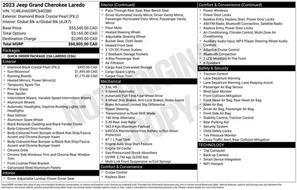 Recent Arrival! Clean CARFAX. Odometer is 1227 miles below market average!*** WE DELIVER ***Diamond Black Crystal Pearlcoat 2023 Jeep Grand Cherokee Laredo 3.6L V6 24V VVT 8-Speed Automatic 4WD 4D Sport Utility172 point inspection certified, 1st oil change free with purchase, 3.45 Rear Axle Ratio, 4-Wheel Disc Brakes, 6 Speakers, ABS brakes, Air Conditioning, Alloy wheels, Anti-whiplash front head restraints, Automatic temperature control, Brake assist, Bumpers: body-color, Cloth Seats, Compass, Delay-off headlights, Driver door bin, Driver vanity mirror, Dual front impact airbags, Dual front side impact airbags, Electronic Stability Control, Emergency communication system, Four wheel independent suspension, Front anti-roll bar, Front Bucket Seats, Front Center Armrest w/Storage, Front dual zone A/C, Front reading lights, Fully automatic headlights, Heated door mirrors, Illuminated entry, Knee airbag, Low tire pressure warning, Molded In Color Black/Gloss Black Roof Rails, MOPAR Black Side Steps, Normal Duty Suspension, Occupant sensing airbag, Outside temperature display, Overhead airbag, Overhead console, Panic alarm, ParkView Rear Back-Up Camera, Passenger door bin, Passenger vanity mirror, Power door mirrors, Power driver seat, Power steering, Power Sunroof (DISC), Power windows, Quick Order Package 23A Laredo, Radio data system, Radio: Uconnect 5 w/8.4 Display, Rear anti-roll bar, Rear reading lights, Rear window defroster, Rear window wiper, Remote keyless entry, Security system, Speed control, Speed-Sensitive Wipers, Split folding rear seat, Spoiler, Steering wheel mounted audio controls, Tachometer, Telescoping steering wheel, Tilt steering wheel, Traction control, Trip computer, Variably intermittent wipers, Voltmeter, Wheels: 17 x 6.5 Fully Painted Aluminum, 3.45 Rear Axle Ratio, 4-Wheel Disc Brakes, 6 Speakers, ABS brakes, Air Conditioning, Alloy wheels, Anti-whiplash front head restraints, Automatic temperature control, Brake assist, Bumpers: body-color, Cloth Seats, Compass, Delay-off headlights, Driver door bin, Driver vanity mirror, Dual front impact airbags, Dual front side impact airbags, Electronic Stability Control, Emergency communication system, Four wheel independent suspension, Front anti-roll bar, Front Bucket Seats, Front Center Armrest w/Storage, Front dual zone A/C, Front reading lights, Fully automatic headlights, Heated door mirrors, Illuminated entry, Knee airbag, Low tire pressure warning, Molded In Color Black/Gloss Black Roof Rails, MOPAR Black Side Steps, Normal Duty Suspension, Occupant sensing airbag, Outside temperature display, Overhead airbag, Overhead console, Panic alarm, ParkView Rear Back-Up Camera, Passenger door bin, Passenger vanity mirror, Power door mirrors, Power driver seat, Power steering, Power Sunroof (DISC), Power windows, Quick Order Package 23A Laredo, Radio data system, Radio: Uconnect 5 w/8.4 Display, Rear anti-roll bar, Rear reading lights, Rear window defroster, Rear window wiper, Remote keyless entry, Security system, Speed control, Speed-Sensitive Wipers, Split folding rear seat, Spoiler, Steering wheel mounted audio controls, Tachometer, Telescoping steering wheel, Tilt steering wheel, Traction control, Trip computer, Variably intermittent wipers, Voltmeter, Wheels: 17 x 6.5 Fully Painted Aluminum.