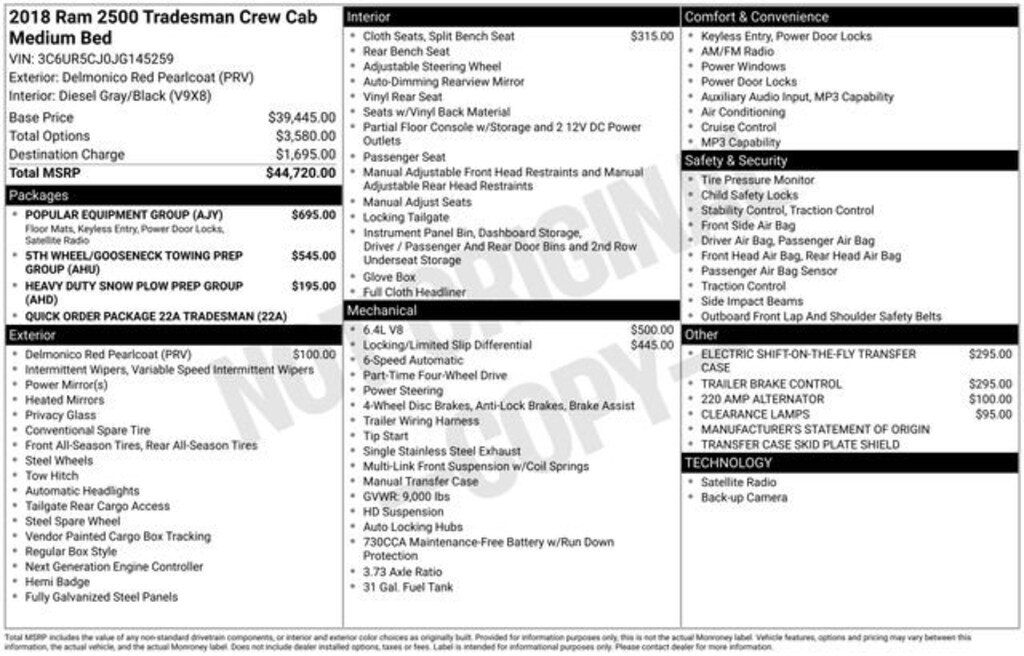 172 point inspection certified, 1st oil change free with purchase, Stolen vehicle location/ Recovery system, Driver monitoring system, Vehicle Usage Alerts, In-vehicle virtual assistant, Vehicle usage alerts, 1-Yr SiriusXM Radio Service, 17 x 7.5 Steel Styled Wheels, 220 Amp Alternator, 3.73 Axle Ratio, 4-Wheel Disc Brakes, 40/20/40 Split Bench Seat, 5th Wheel/Gooseneck Towing Prep Group, 6 Speakers, ABS brakes, Air Conditioning, AM/FM radio, Anti-Spin Differential Rear Axle, Auto-dimming Rear-View mirror, Black Exterior Mirrors, Brake assist, Carpet Floor Covering, Center Hub, Clearance Lamps, Delay-off headlights, Driver door bin, Dual front impact airbags, Dual front side impact airbags, Electric Shift-On-The-Fly Transfer Case, Electronic Stability Control, Electronically Controlled Throttle, Exterior Mirrors w/Heating Element, For More Info, Call 800-643-2112, Front & Rear Floor Mats, Front anti-roll bar, Front Armrest w/Cupholders, Front Center Armrest, Fully automatic headlights, Heated door mirrors, Heavy Duty Snow Plow Prep Group, Heavy Duty Vinyl 40/20/40 Split Bench Seat, Hemi Badge, Locking Tailgate, Low tire pressure warning, Manual Adjust Seats, Manufacturer's Statement of Origin, Media Hub (USB, AUX), Next Generation Engine Controller, Occupant sensing airbag, Overhead airbag, ParkView Rear Back-Up Camera, Passenger door bin, Popular Equipment Group, Power door mirrors, Power steering, Power windows, Quick Order Package 22A Tradesman, Radio data system, Radio: 3.0, Rear Folding Seat, Rear step bumper, Remote Keyless Entry, SiriusXM Satellite Radio, Speed control, Storage Tray, Tachometer, Tilt steering wheel, Tip Start, Traction control, Trailer Brake Control, Variably intermittent wipers, Vendor Painted Cargo Box Tracking, Voltmeter, 1-Yr SiriusXM Radio Service, 17 x 7.5 Steel Styled Wheels, 220 Amp Alternator, 3.73 Axle Ratio, 4-Wheel Disc Brakes, 40/20/40 Split Bench Seat, 5th Wheel/Gooseneck Towing Prep Group, 6 Speakers, ABS brakes, Air Conditioning, AM/FM radio, Anti-Spin Differential Rear Axle, Auto-dimming Rear-View mirror, Black Exterior Mirrors, Brake assist, Carpet Floor Covering, Center Hub, Clearance Lamps, Delay-off headlights, Driver door bin, Dual front impact airbags, Dual front side impact airbags, Electric Shift-On-The-Fly Transfer Case, Electronic Stability Control, Electronically Controlled Throttle, Exterior Mirrors w/Heating Element, For More Info, Call 800-643-2112, Front & Rear Floor Mats, Front anti-roll bar, Front Armrest w/Cupholders, Front Center Armrest, Fully automatic headlights, Heated door mirrors, Heavy Duty Snow Plow Prep Group, Heavy Duty Vinyl 40/20/40 Split Bench Seat, Hemi Badge, Locking Tailgate, Low tire pressure warning, Manual Adjust Seats, Manufacturer's Statement of Origin, Media Hub (USB, AUX), Next Generation Engine Controller, Occupant sensing airbag, Overhead airbag, ParkView Rear Back-Up Camera, Passenger door bin, Popular Equipment Group, Power door mirrors, Power steering, Power windows, Quick Order Package 22A Tradesman, Radio data system, Radio: 3.0, Rear Folding Seat, Rear step bumper, Remote Keyless Entry, SiriusXM Satellite Radio, Speed control, Storage Tray, Tachometer, Tilt steering wheel, Tip Start, Traction control, Trailer Brake Control, Variably intermittent wipers, Vendor Painted Cargo Box Tracking, Voltmeter.