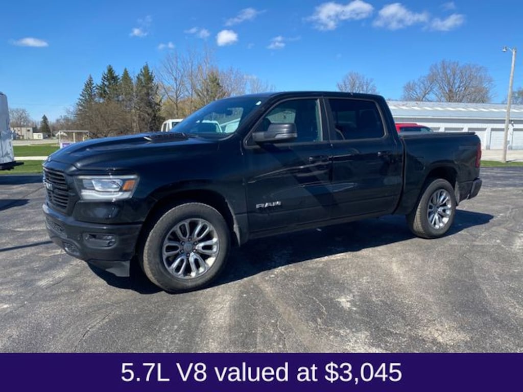 Local Trade, Non Smoker, Leather Seats, 110 point inspection certified, 172 point inspection certified, 1st oil change free with purchase, All weather floor matts, Ceramic coating available on all purchases at discounted pricing, Cooling Seats, Heated Seats, #1 Seat Foam Cushion, 10 Speakers, 12" Touchscreen Display, 2nd Row In Floor Storage Bins, 3 Rear Seat Head Restraints, 3.21 Rear Axle Ratio, 4 Way Front Headrests, 4-Wheel Disc Brakes, 48V Belt Starter Generator, 4G LTE Wi-Fi Hot Spot, ABS brakes, Adjustable pedals, Air Conditioning, Alloy wheels, AM/FM radio: SiriusXM with 360L, Apple CarPlay, Apple CarPlay/Android Auto, Audio memory, Auto High Beam Headlamp Control, Auto-dimming door mirrors, Auto-Dimming Exterior Driver Mirror, Auto-dimming Rear-View mirror, Automatic temperature control, Black Interior Accents, Blind Spot & Cross Path Detection, Body Color Exterior Mirrors, Body Color Front Bumper, Body Color Premium Power Mirrors, Body Color Rear Bumper w/Step Pads, Brake assist, Bumpers: chrome, Chrome Exterior Mirrors, Class IV Receiver Hitch, Compass, Connected Travel & Traffic Services, Connectivity - US/Canada, Convex Wide-Angle Exterior Mirror Insert, Delay-off headlights, Disassociated Touchscreen Display, Driver door bin, Driver Seat Memory, Driver vanity mirror, Dual front impact airbags, Dual front side impact airbags, Electric Shift-On-Demand Transfer Case, Electronic Stability Control, Exterior Mirrors Courtesy Lamps, Exterior Mirrors w/Heating Element, Exterior Mirrors w/Memory, Exterior Mirrors w/Supplemental Signals, Foam Bottle Insert (Door Trim Panel), For Details, Visit DriveUconnect.com, For More Info, Call 800-643-2112, Front anti-roll bar, Front Center Armrest w/Storage, Front Door Accent Lighting, Front dual zone A/C, Front fog lights, Front LED Fog Lamps, Front reading lights, Front Seat Back Map Pockets, Front wheel independent suspension, Fully automatic headlights, Garage door transmitter, Global Telematics Box Module (TBM), Google Android Auto, GPS Antenna Input, GPS Navigation, Grille Surround 3 Body Color Tex 2 Black, HD Radio, Heated door mirrors, Heated Front Seats, Heated front seats, Heated Steering Wheel, Heated steering wheel, Illuminated entry, Integrated Center Stack Radio, Integrated Voice Command w/Bluetooth, Laramie Level 1 Equipment Group, Leather steering wheel, Leather Trim 40/20/40 Bench Seat, LED Reflector Headlamps, Low tire pressure warning, Manufacturer's Statement of Origin, Memory seat, MOPAR Front & Rear Rubber Floor Mats, Navigation System, Occupant sensing airbag, Outside temperature display, Overhead airbag, Overhead console, Panic alarm, ParkSense Front/Rear Park Assist w/Stop (DISC), ParkView Rear Back-Up Camera, Passenger door bin, Passenger vanity mirror, Pedal memory, Power 2-Way Driver Lumbar Adjust, Power 2-Way Passenger Lumbar Adjust, Power 8-Way Driver & Passenger Seats, Power door mirrors, Power driver seat, Power passenger seat, Power steering, Power windows, Power-Folding Mirrors, Quick Order Package 27H Laramie, Radio data system, Radio: Uconnect 5 Nav w/12.0" Display, Radio: Uconnect 5 Nav w/8.4" Display, Rain Sensitive Windshield Wipers, RAM Grille Badge - Chrome, Rear 60/40 Folding Seat, Rear anti-roll bar, Rear Door Accent Lighting, Rear Power Sliding Window, Rear seat center armrest, Rear step bumper, Rear Wheelhouse Liners, Rear Window Defroster, Remote keyless entry, Remote Tailgate Release, Security system, SiriusXM Radio Service, SiriusXM w/360L, Speed control, Split folding rear seat, Sport Appearance Package, Sport Decal, Sport Performance Hood, Steering wheel mounted audio controls, Tachometer, Telescoping steering wheel, Tilt steering wheel, Traction control, Trip computer, Turn signal indicat