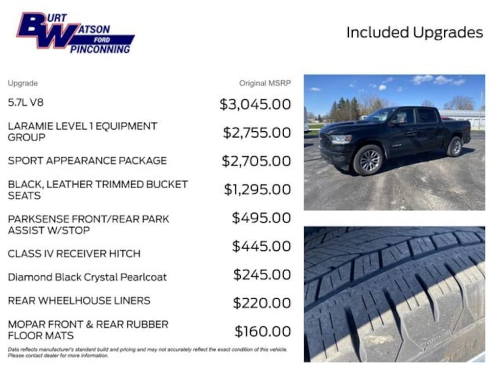 Pricing shown excludes tax, title, license, registration, or other applicable government fees. Any optional products, services, or accessories are also not reflected in the advertised price. At Burt Watson, it is our belief that every customer deserves a buying experience built on clarity and honesty. We're dedicated to doing business the right way, simply and transparently. While we make every effort to ensure the information on our site is accurate and up to date, occasional errors, omissions, or inaccuracies may occur. Additionally, there may be a delay between when a vehicle is sold and when our online inventory is updated. We encourage you to confirm all vehicle details and pricing directly with our team before purchase.